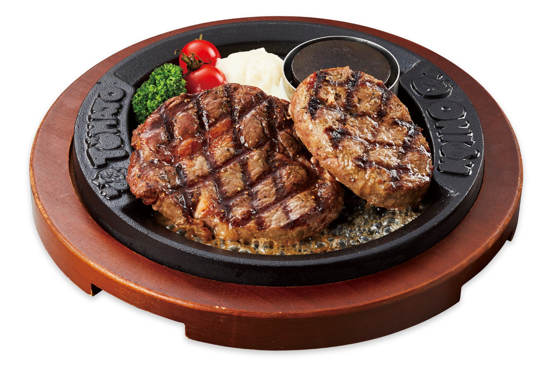 厚切りリブロースと、当店の看板メニューである弾丸ハンバーグのコンビ。