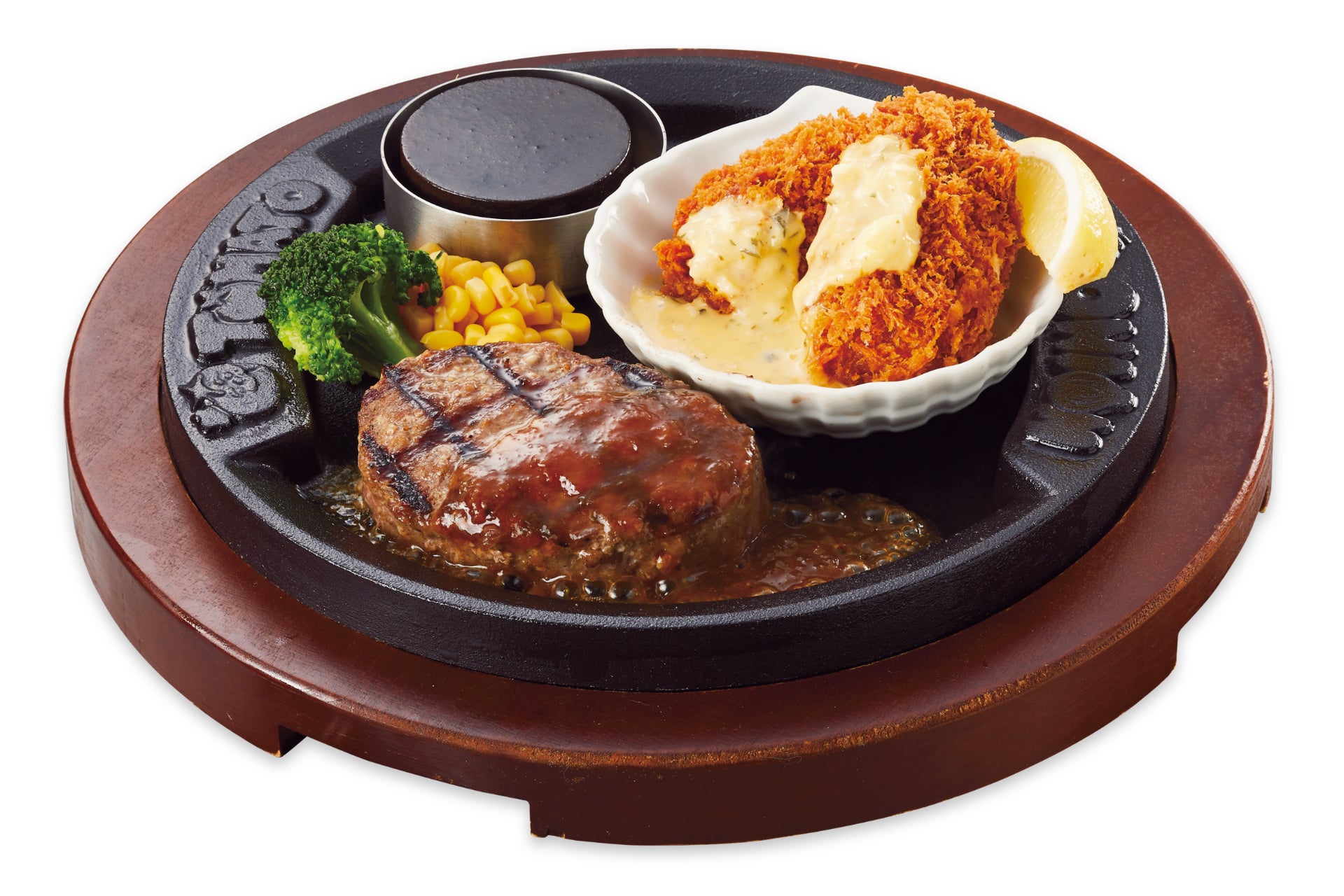 当店の看板メニューである弾丸ハンバーグと、広島県産大粒牡蠣フライのコンビ。