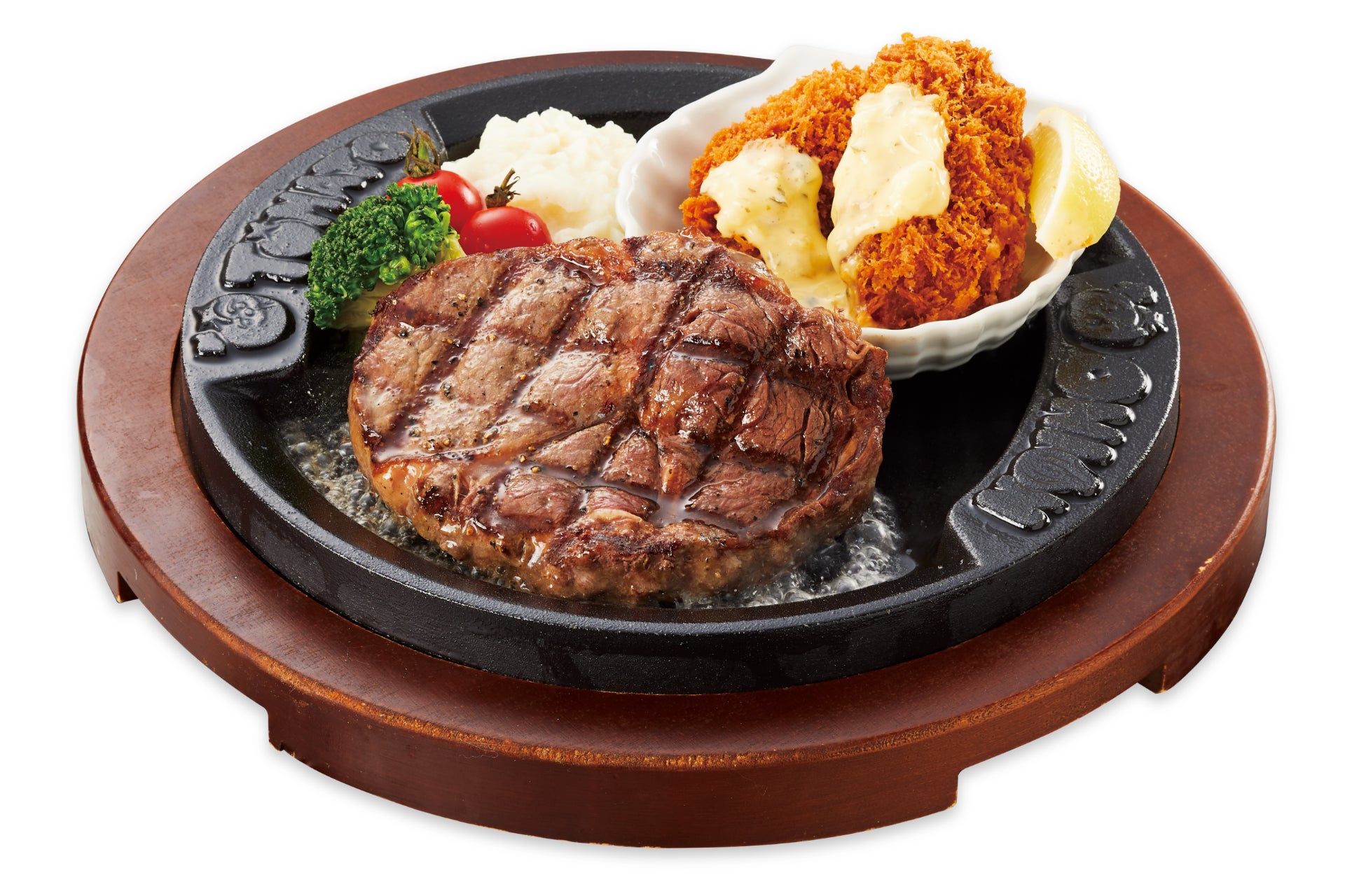 厚切りリブロースと、広島県産大粒牡蠣フライのコンビ。