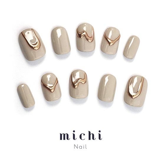 シックなベージュのワンカラーにブロンズゴールドのミラーラインをほどこしたこちらのネイル。とろけるようなデザインが魅力的で個性派なネイルをお探しの方にお勧めです。芸術的なデザインですが、ベースカラーがシンプルなため、日常使いもしやすくなっています。