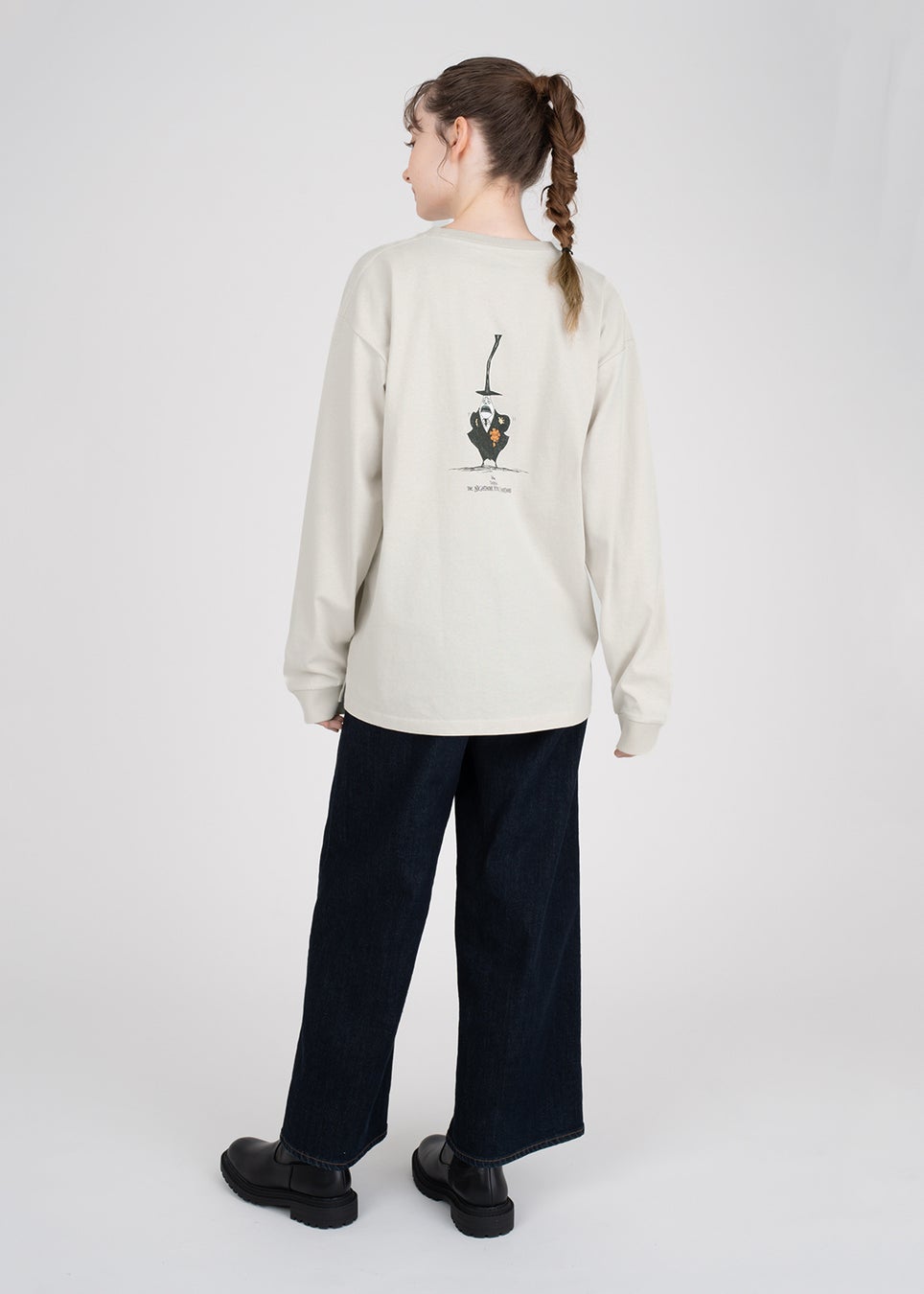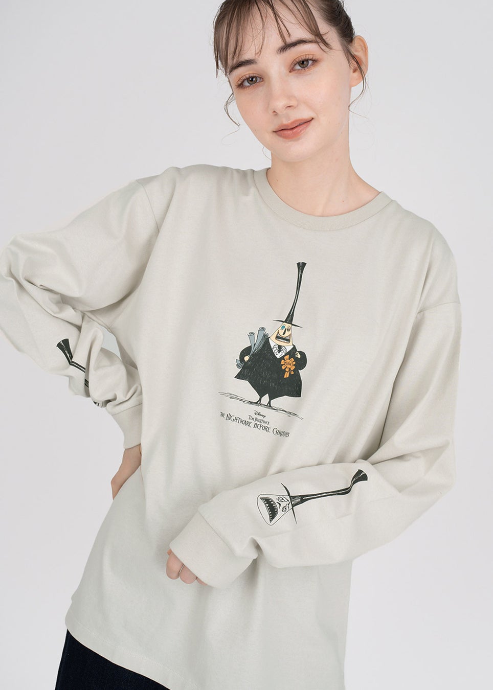 ハロウィン・タウンの町長。2つの顔を持ち感情によって顔が入れ替わります。フロントとバックで違う顔のメイヤーが楽しめるデザインです。風合いの良い天竺を使用した、袖口がリブタイプの長袖Tシャツ。