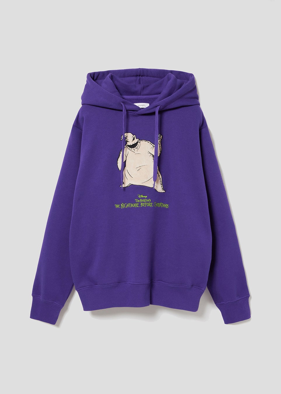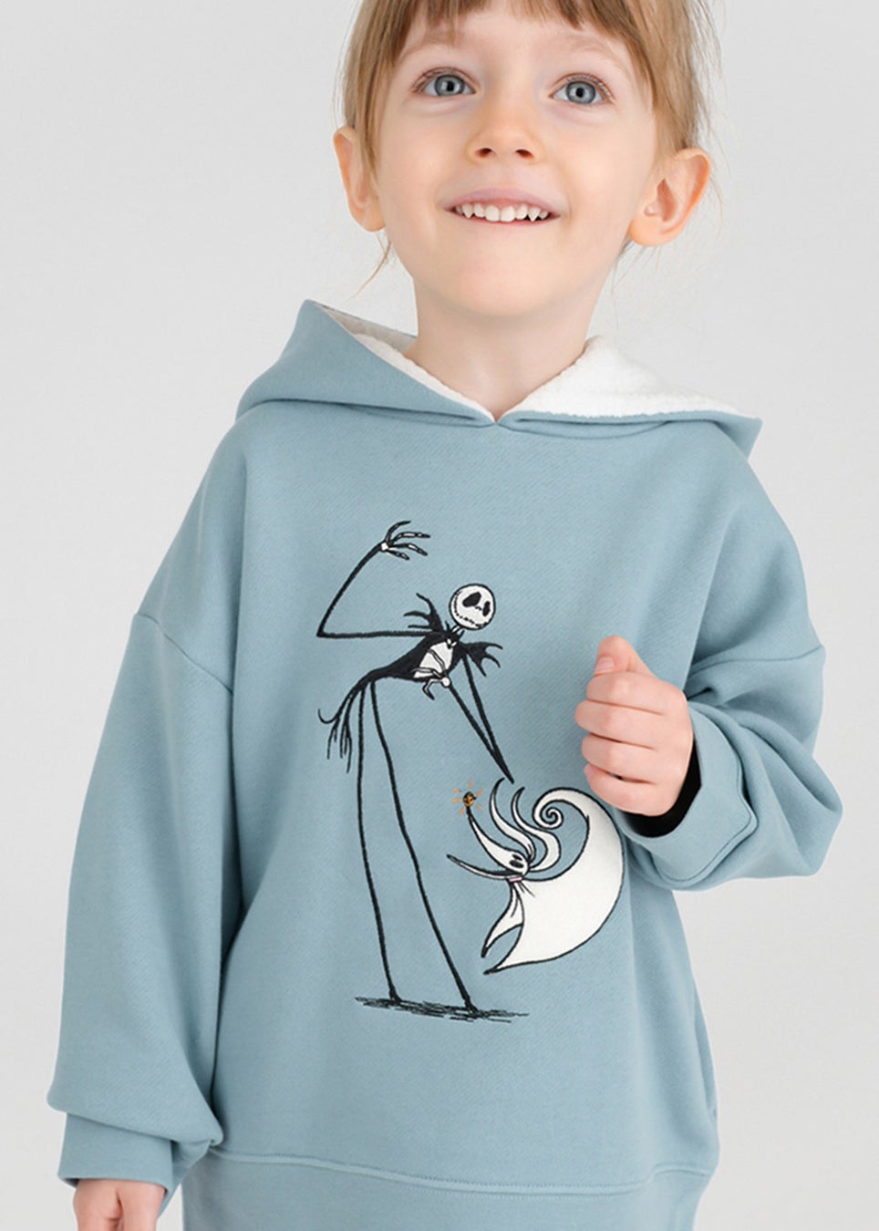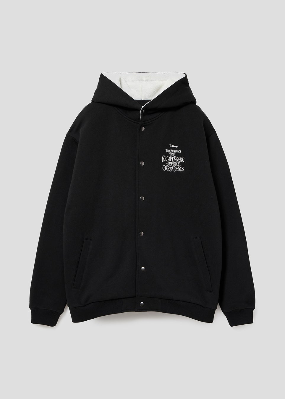 ハロウィン・タウンの“カボチャ王”ジャック・スケリントンが満月を背に丘に立つ姿をバックに大胆にプリントしたスウェットブルゾン。フロントにはタイトルロゴが刺繍されています。しっかりとした裏毛を使用したスウェットブルゾンで大きめの身幅や落ちた肩など、ほどよくリラックス感のあるシルエットです。