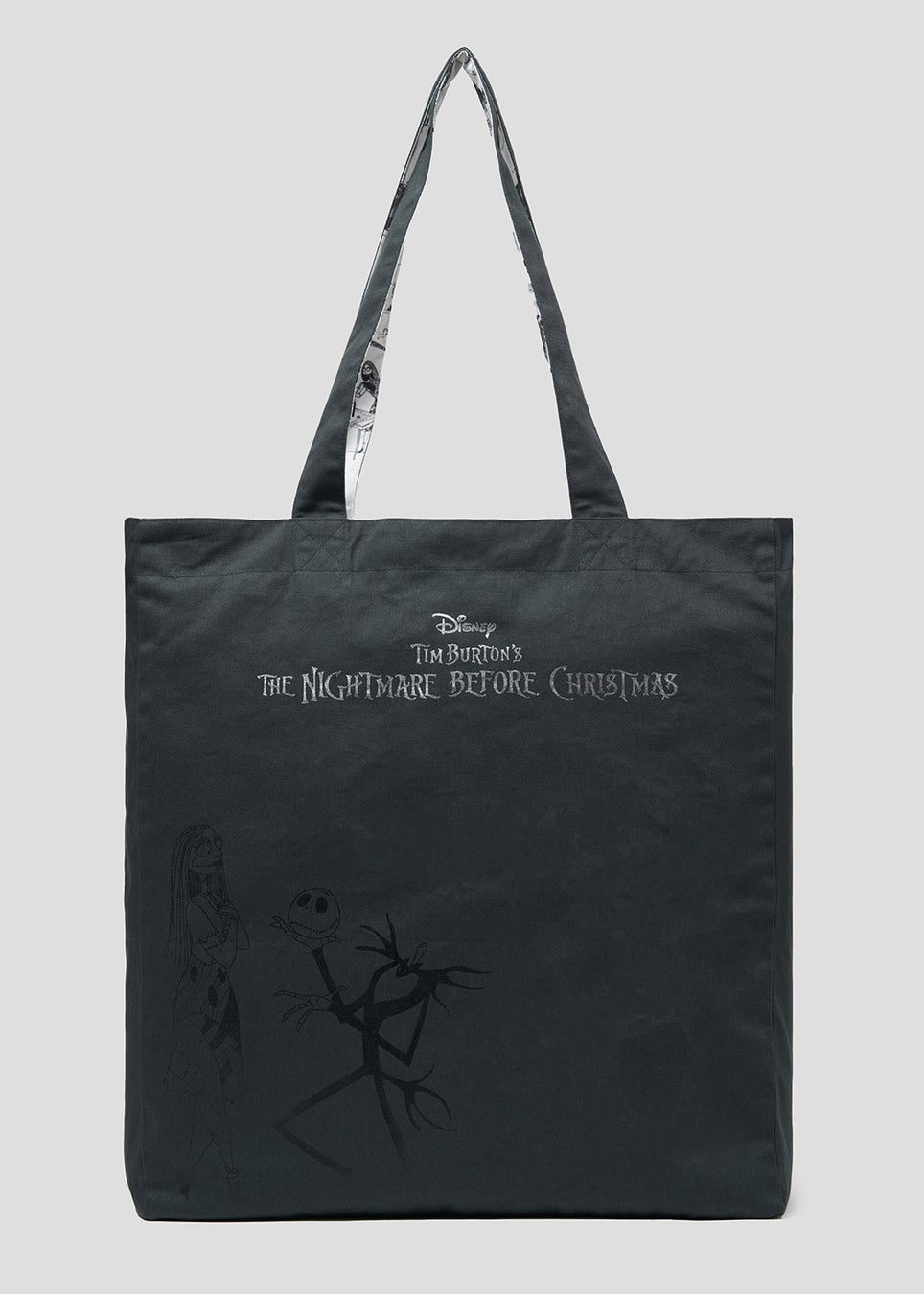 タイトルロゴ、ジャック、サリーがデザインされたシンプルな面と、ハロウィン・タウンの住人を散りばめたパターン柄の面のリバーシブル仕様のトートバッグ。手提げや肩掛けにも対応。パターン柄の面にはポケットがあり、イヤホンやパスケース、スマートフォン等の小物を収納できます。