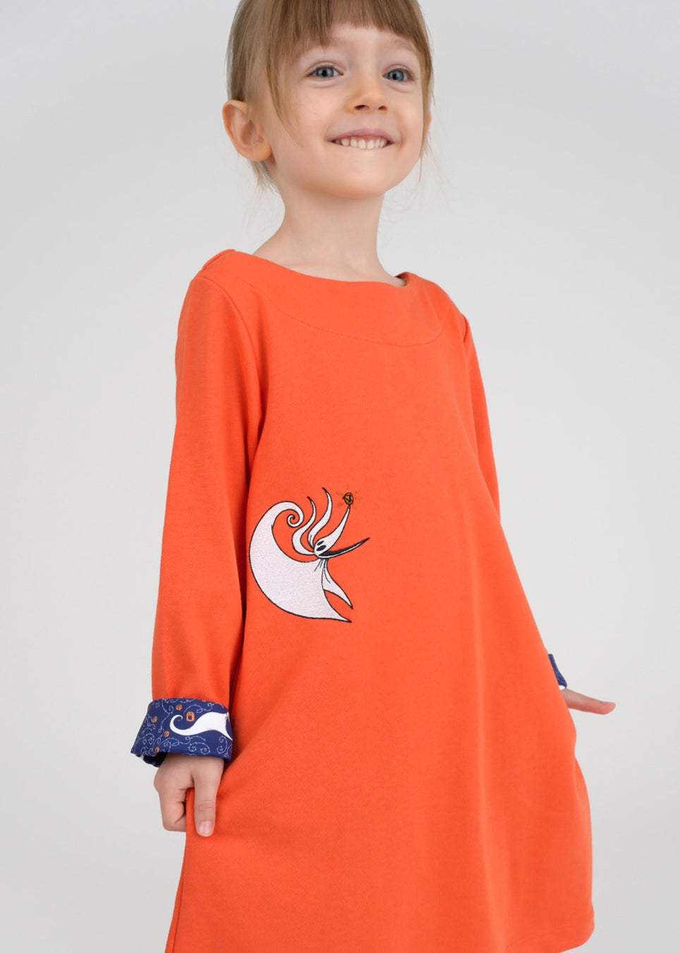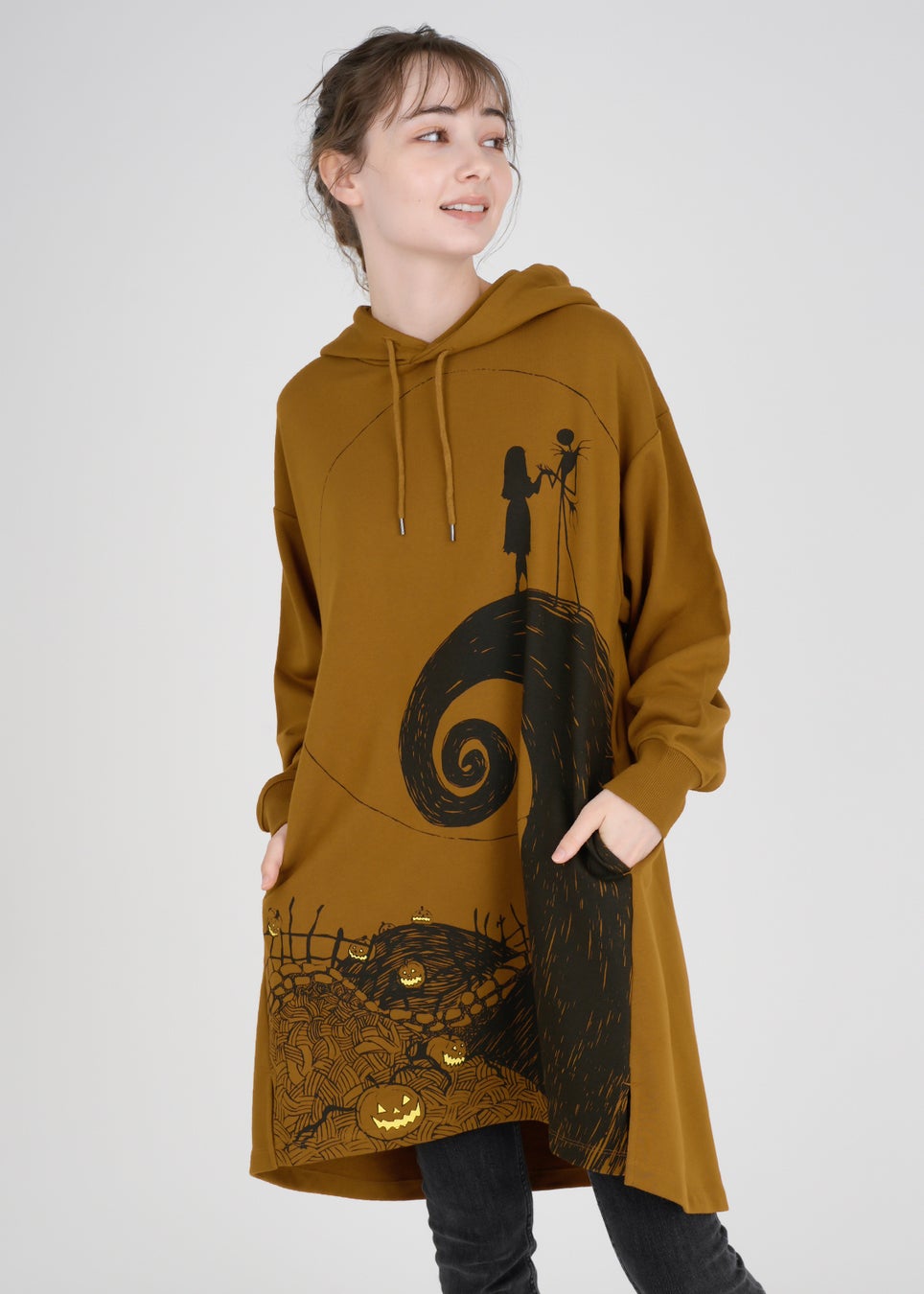 幽霊犬のゼロを刺繍したデザインに、背当てと袖裏はゼロとかぼちゃのパターン柄。袖は折り返すと総柄プリントになっています。Aラインシルエットのミニ裏毛のワンピースで、サイドシームポケット付き。