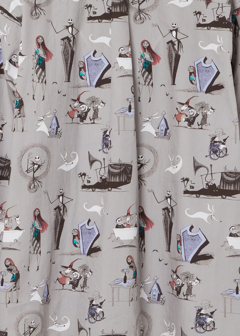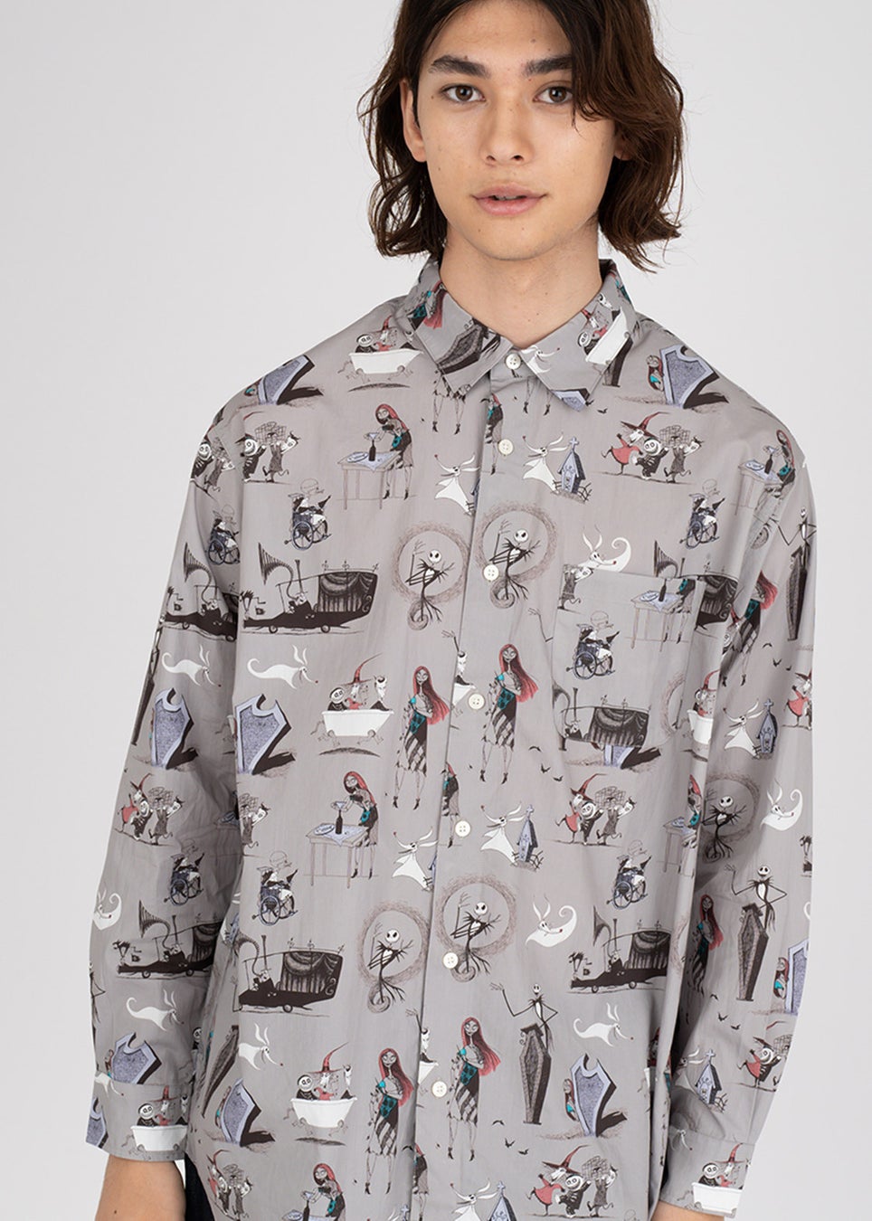 ジャック、サリー、ゼロ、メイヤー、フィンケルスタイン博士、ロック、ショック、バレルなど、ハロウィン・タウンの住人を散りばめたパターン柄です。なめらかな表面が特徴のタイプライター生地を使用した、ベーシックな長袖シャツ。