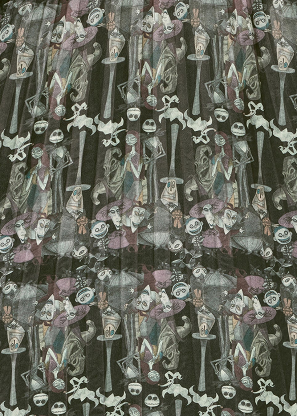 ジャック、サリー、ゼロ、メイヤー、ロック、ショック、バレル、ヴァンパイア・テディが集合したデザインをパターン柄にしたダークで雰囲気のある1枚です。
