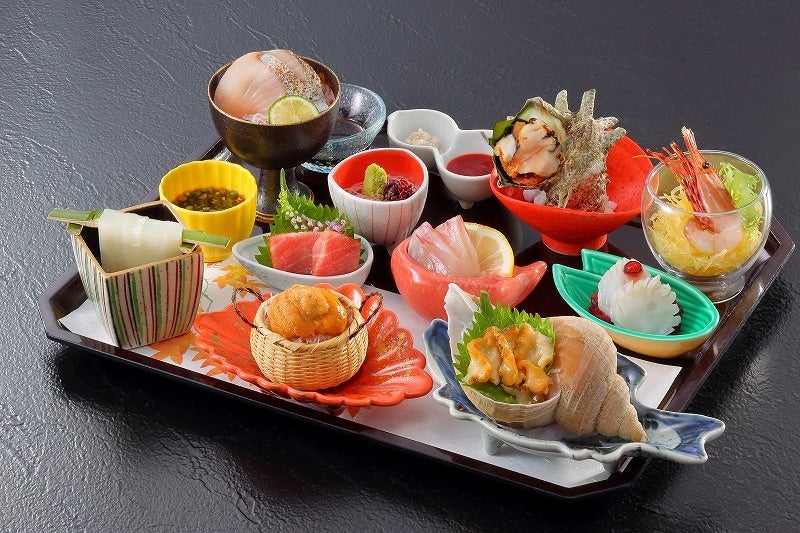 個室で見た目も華やかな贅を尽くした食を堪能できるプラン。庄内浜を中心とした日本海で獲れた新鮮な魚介類9種類を贅沢に盛り合わせたお刺身九重盛りに加え、活アワビの陶板焼き、フグのから揚げ、メインにはのどぐろの煮付けをご用意。豪華な海の幸を存分に満喫できるコースです。
