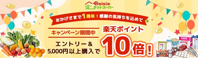ベイシアネットスーパーでの1回の注文あたりのお買い物金額が5,000円(税込)以上の方に、期間中毎回、楽天ポイントを10倍付与します。