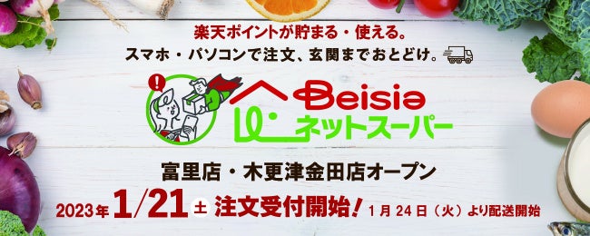 株式会社ベイシア(本社:群馬県前橋市、代表取締役社長:相木孝仁)は、楽天グループ株式会社(以下「楽天」)が提供するネットスーパーのプラットフォーム「楽天全国スーパー」内に出店する「ベイシアネットスーパー」において、2023年1月24日より富里店・木更津金田店での配送を開始いたします。
