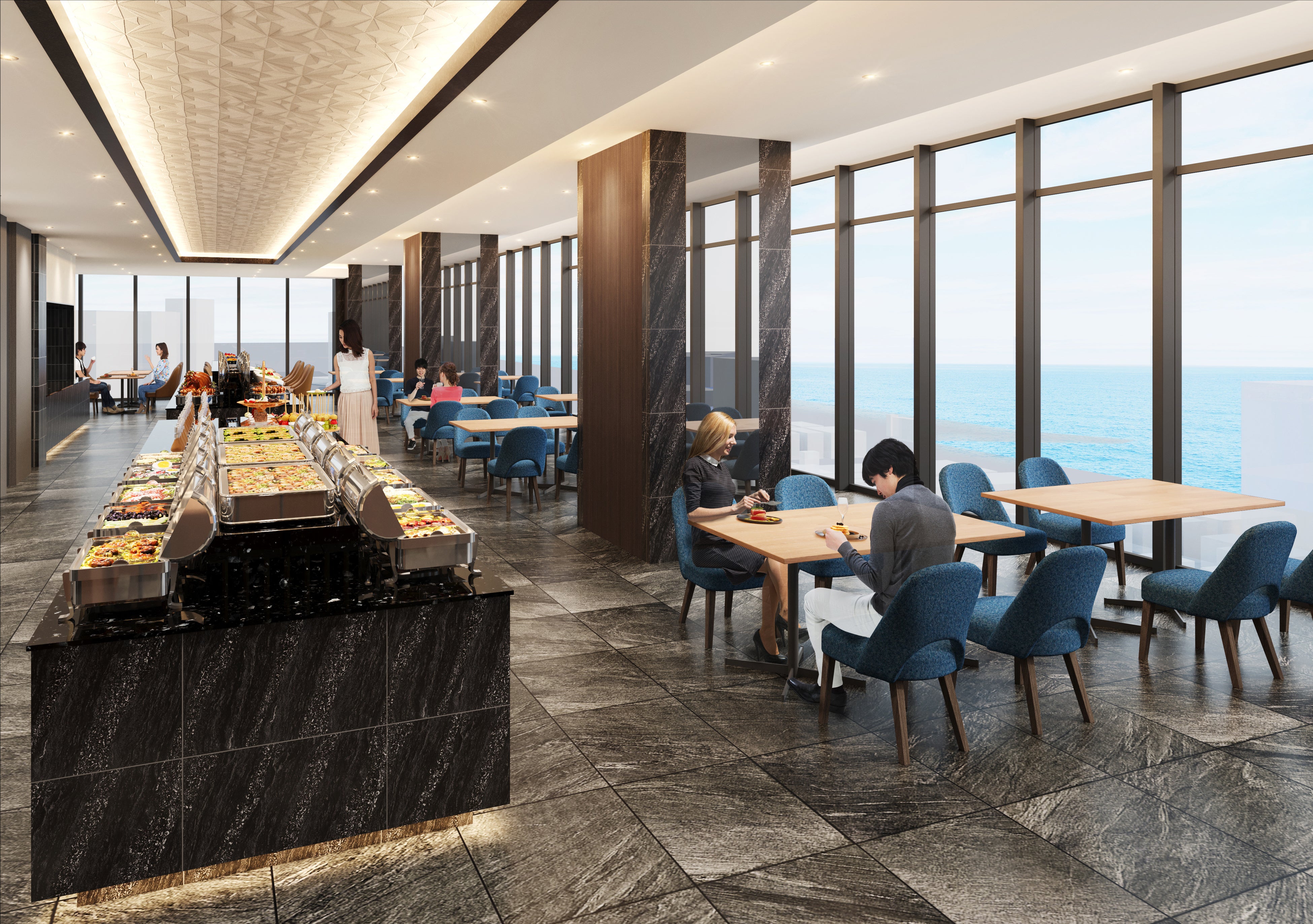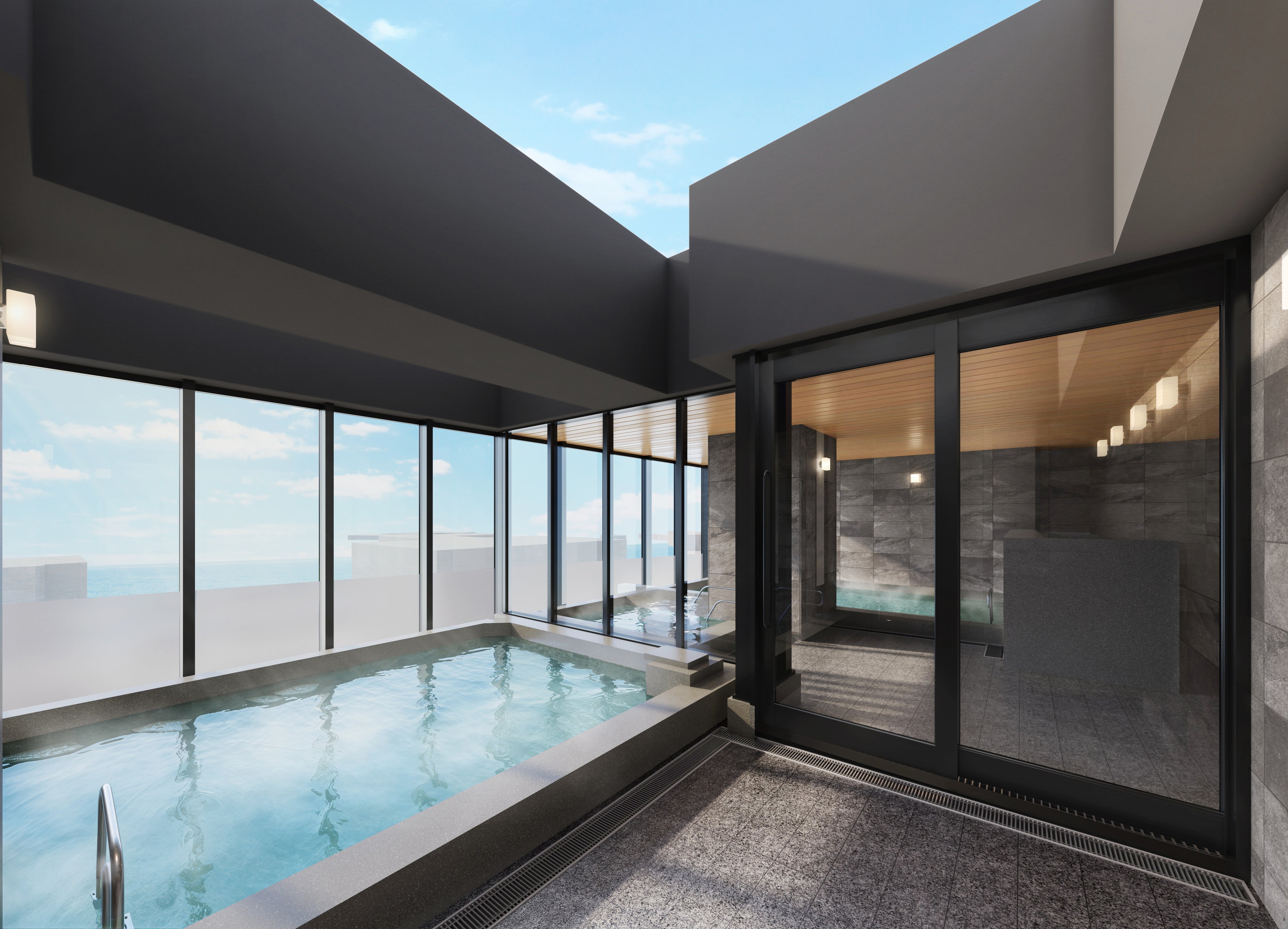 その他、1階の中庭には天然温泉を使用した足湯と、ホテル最上階には天然温泉の露天風呂やサウナ、レストランを完備。レストランでは眺望を楽しみながら、熱海食材も使用したカジュアルフレンチブッフェをご堪能いただけます。