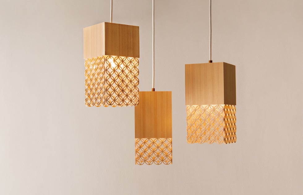 七宝組子と無垢な木の表情とのコントラストで魅せるペンダントライトです。