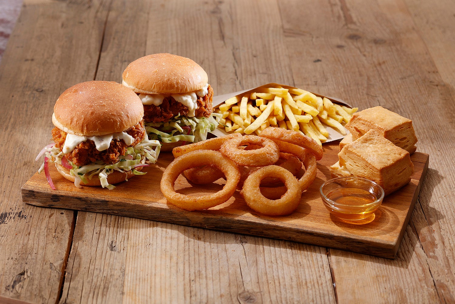 とろけるバターミルクタルタルのチキンバーガー2個、ポテトL×1個、オニオンリングL×1個、ビスケット2個