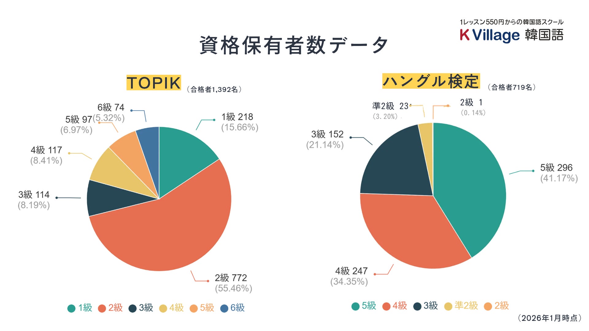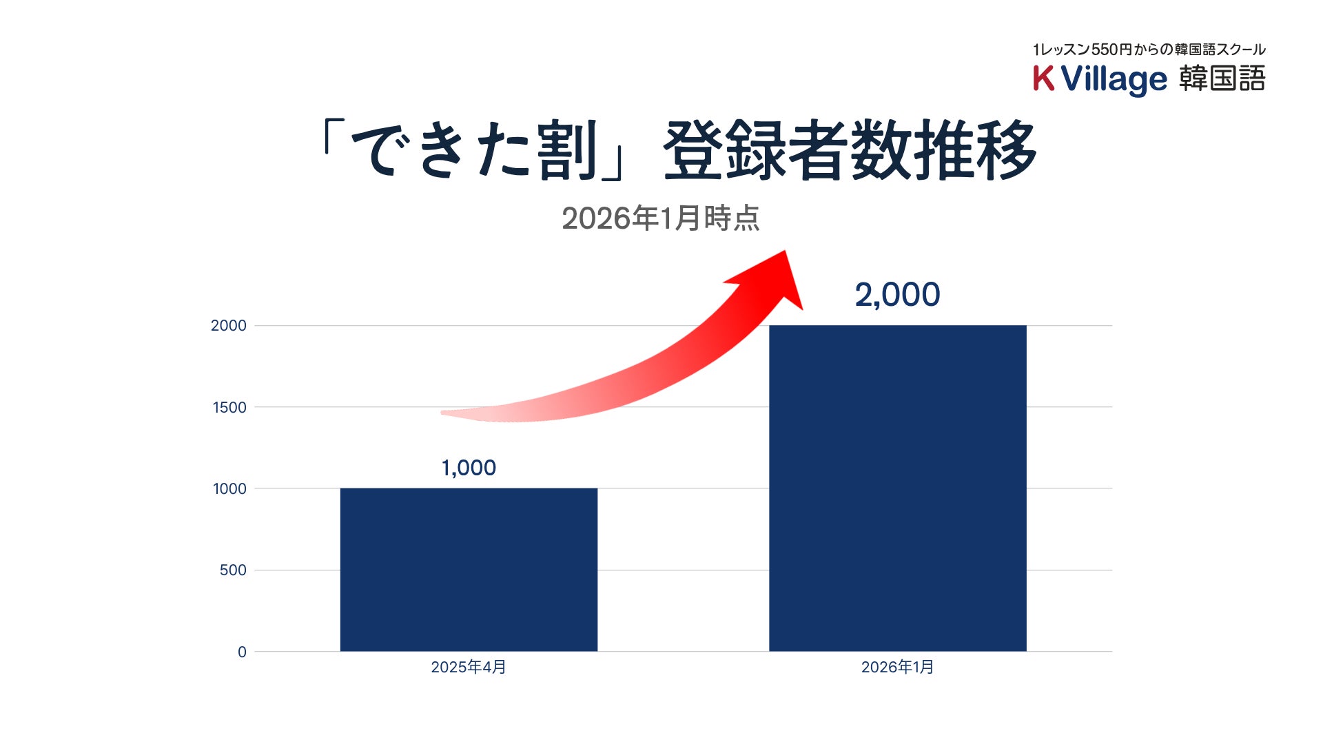 日本最大級の韓国語教室「K Village韓国語」を運営する株式会社K Village(本社:東京都新宿区、代表取締役社長:桑原 元就)は、2024年10月に開始した学習者支援制度「スタディサポート(通称:スタサポ)」第1弾施策である、韓国語資格合格者向け月謝割引制度「できた割」において、登録者数が2026年1月時点で累計2,000名を突破したことをお知らせします。