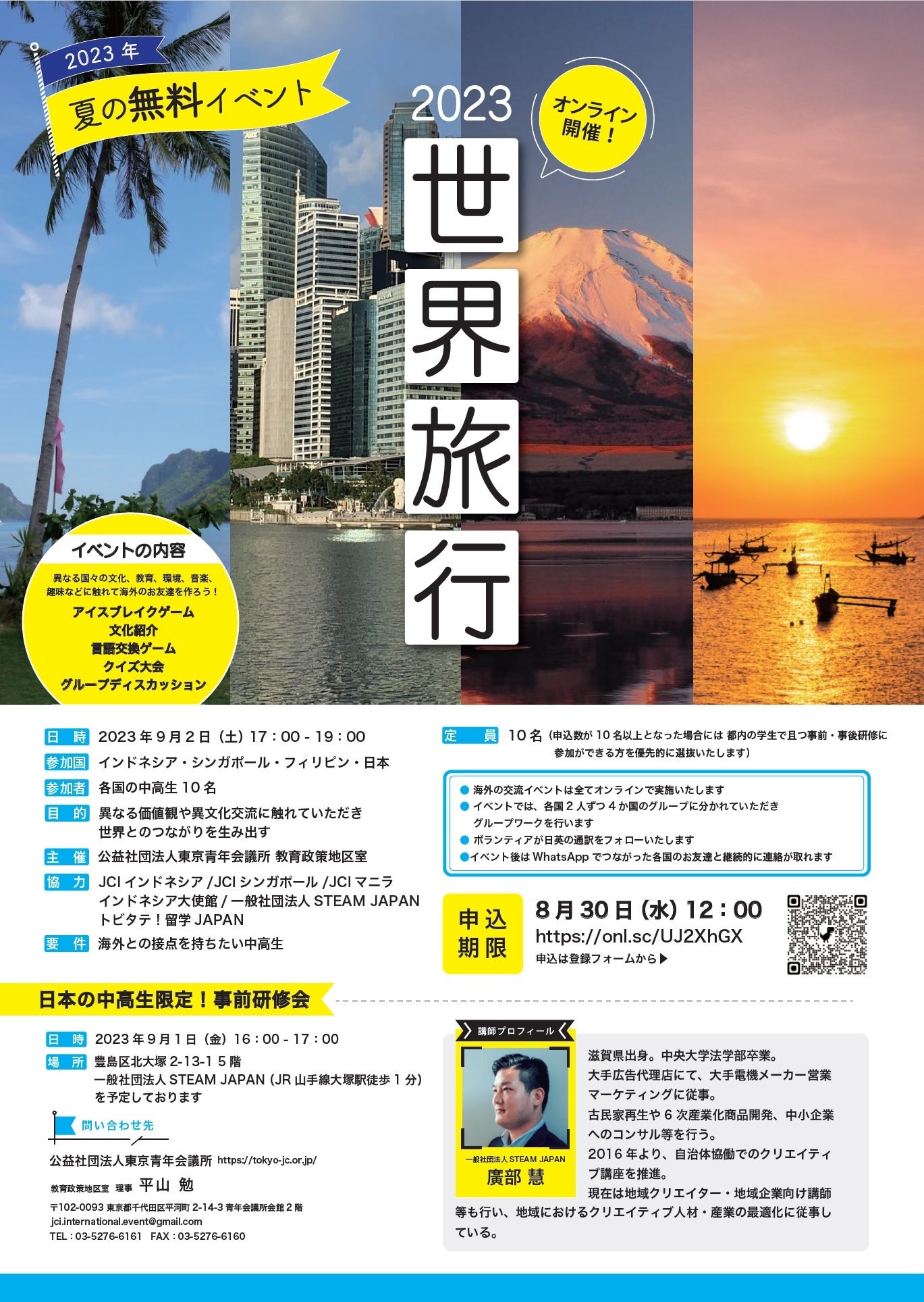 【参加費無料】公益社団法人東京青年会議所が世界の中高生たちが参加するオンラインイベントを9月2日(金)17時~19時に開催! #国際交流