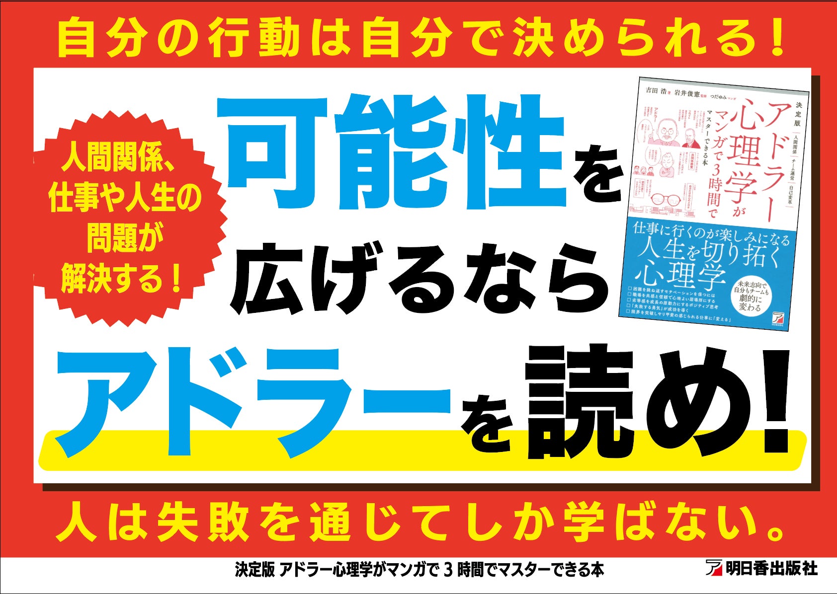 明日香出版社(東京都文京区)は、3月13日(木)に、新刊『決定版 アドラー心理学がマンガで3時間でマスターできる本』(吉田 浩 著、岩井 俊憲 監修、 つだゆみ マンガ)を発売しました。