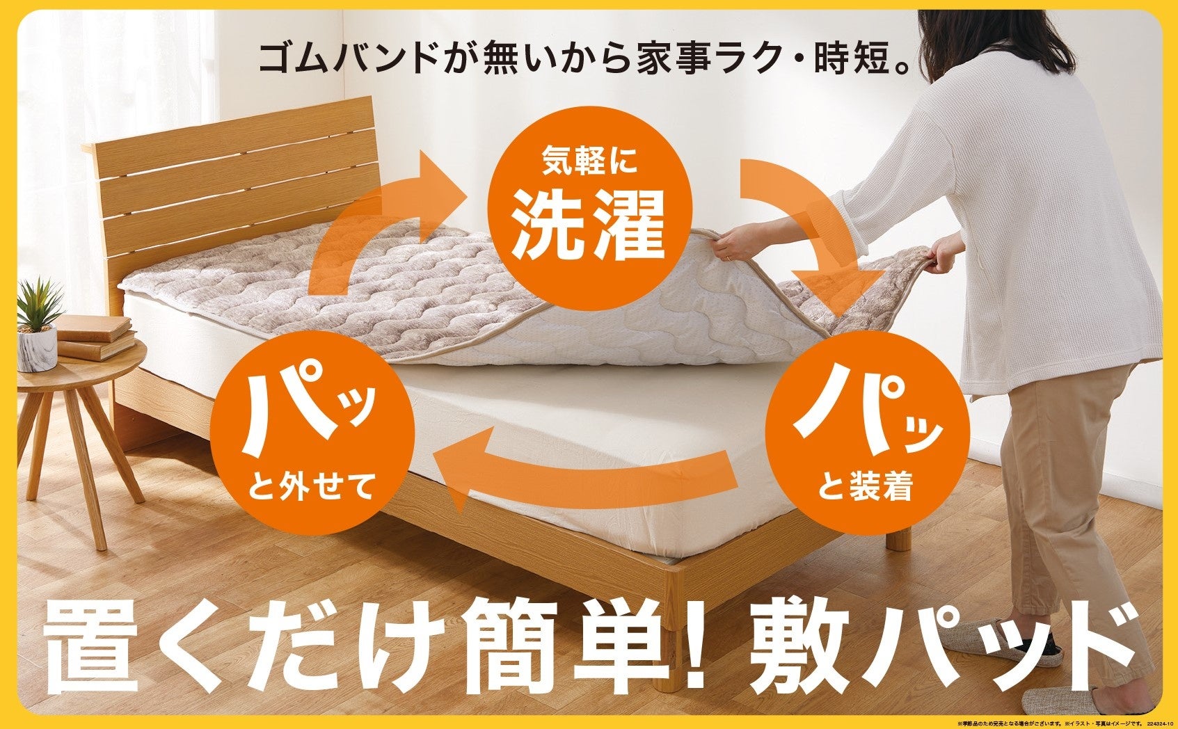 お客様からのご要望にお応えし、今年のモデルはさらにズレにくくなりました。中のわたやキルティングパターン等の見直しを行い、また裏面の滑り止めの数を増やして配置も変えたことで、よりズレにくい仕様に。ゴムバンドが無く、設置も取り外しもパッとできて気軽に洗濯ができます。