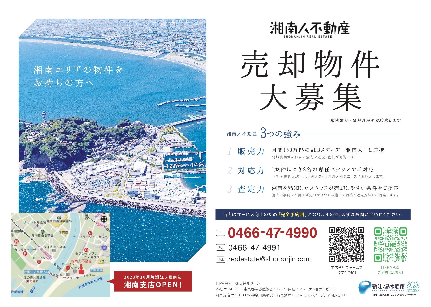 湘南地域(藤沢、茅ヶ崎、鎌倉、逗子、平塚、大磯、二宮、小田原など)の不動産なら湘南人不動産にお任せください!月間150万PVのWEBメディア「湘南人(https://shonanjin.com/)」と連携した、地域密着型の告知も可能です。