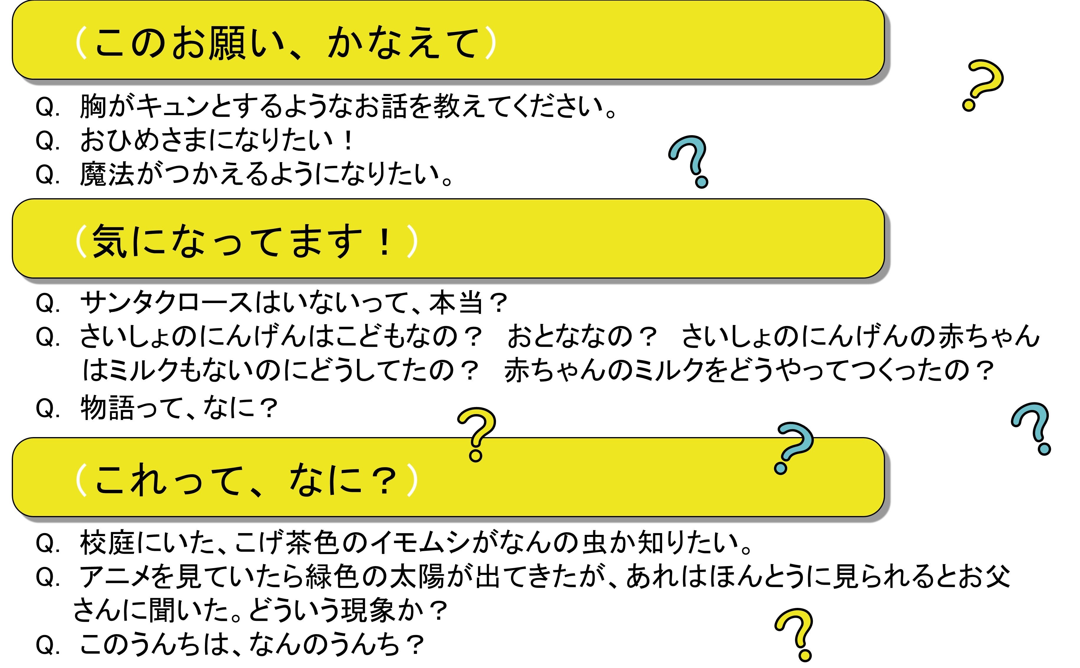 たとえば、「胸がキュンとするようなお話を教えてください」「サンタクロースはいないって、本当?」「魔法がつかえるようになりたい」「おひめさまになりたい!」「さいしょのにんげんはこどもなの? おとななの?」「飼っているカマキリを戦いに強くしたいです。どうやったらできますか?」「絵本にカバーはなんでついているの?」「神さまって、なに?」「ねぇ、赤ちゃんの出てくる本ない?」などなど。