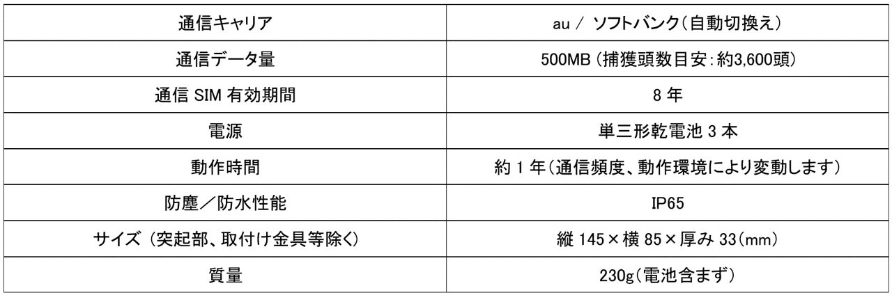 ※動作時間は、捕獲数、通信頻度および動作環境により大きく変動します。