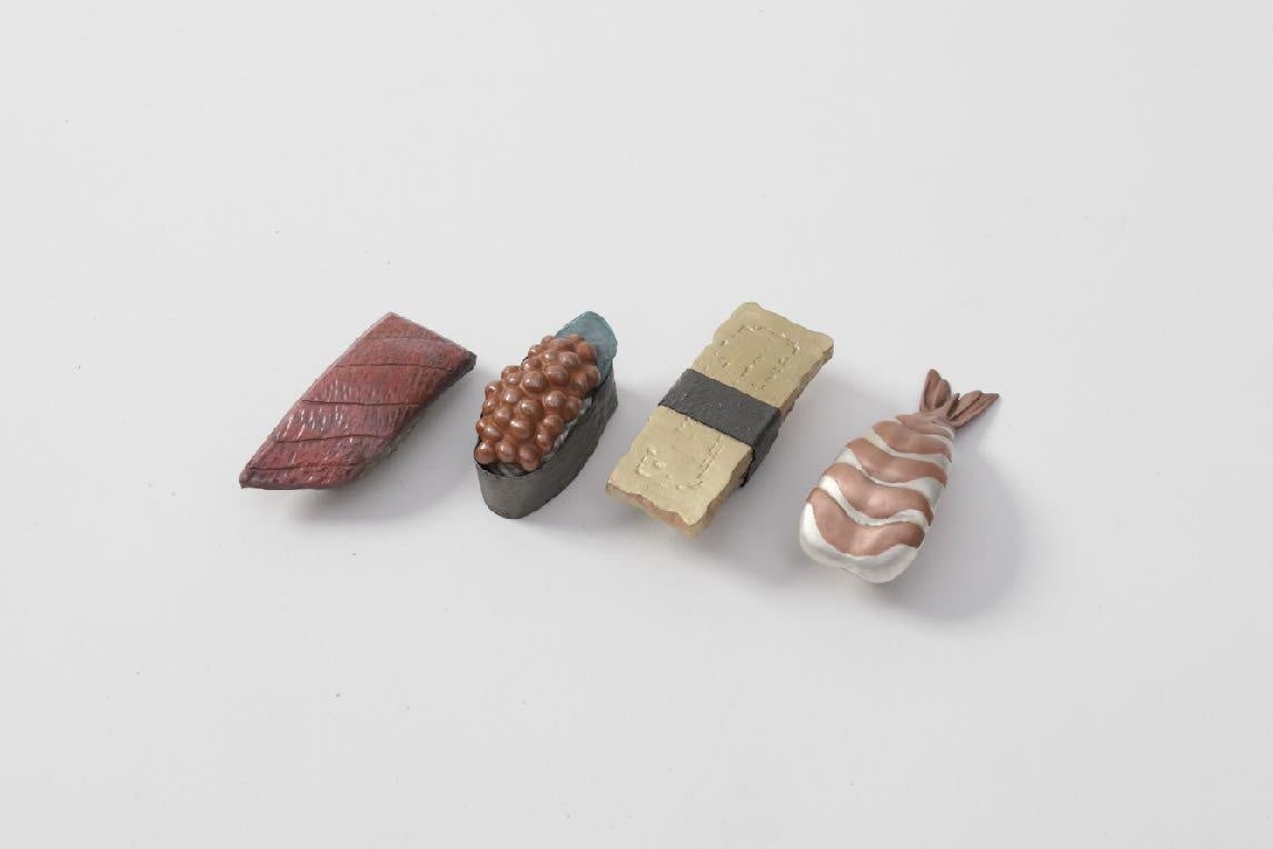 作品概要: 伝統的な彫金・打ち出し技法を駆使し、金属の化学変化による発色のみで寿司の鮮やかな色彩を再現した工芸作品。