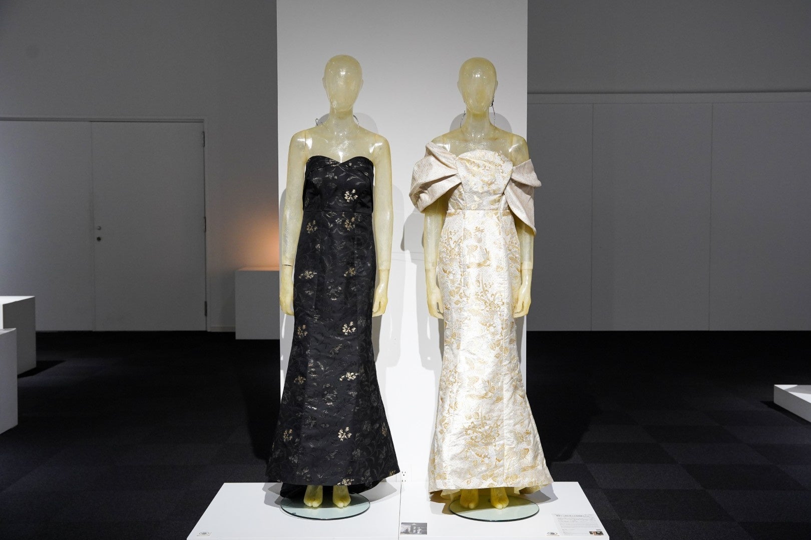 作品概要: 母娘が同じ西陣織を帯やドレスとして共に纏う「体験」を提案し、結婚式における感情を「陽と陰」に見立てて仕立てた2着の西陣織ドレス。