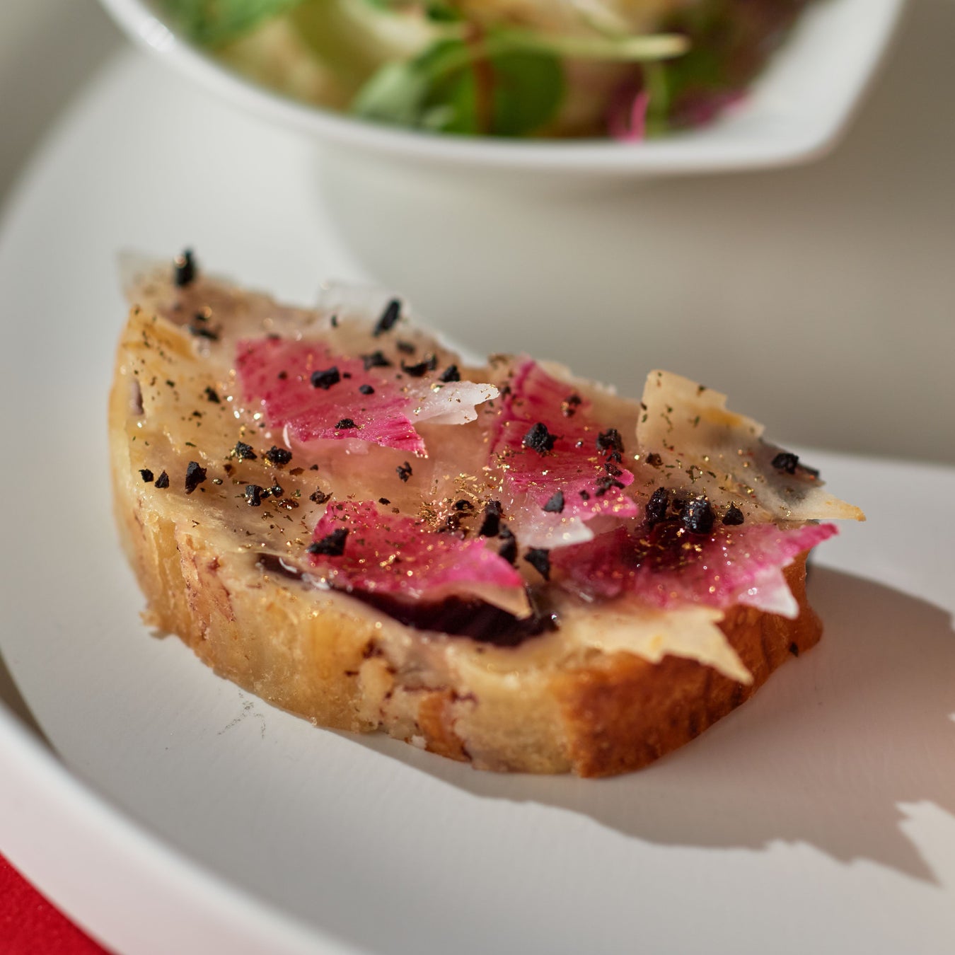 フランスのフェスティブシーズンに欠かせないパイ生地でパテを包んだフレンチセイボリーをご用意いたしました。パテには豚鶏鴨牛4種のしっかりとした肉感にきめ細かなしっとりとした鶏レバーを合わせ、一口でも感じるしっかりとした濃厚な味わいが特徴です。トップには蕪と大根のマリネを乗せ、シャキシャキの食感をアクセントに合わせました。特別なイベントを更に華やかにするトリュフも重ねて、高揚感に浸るひと時をお届けします。