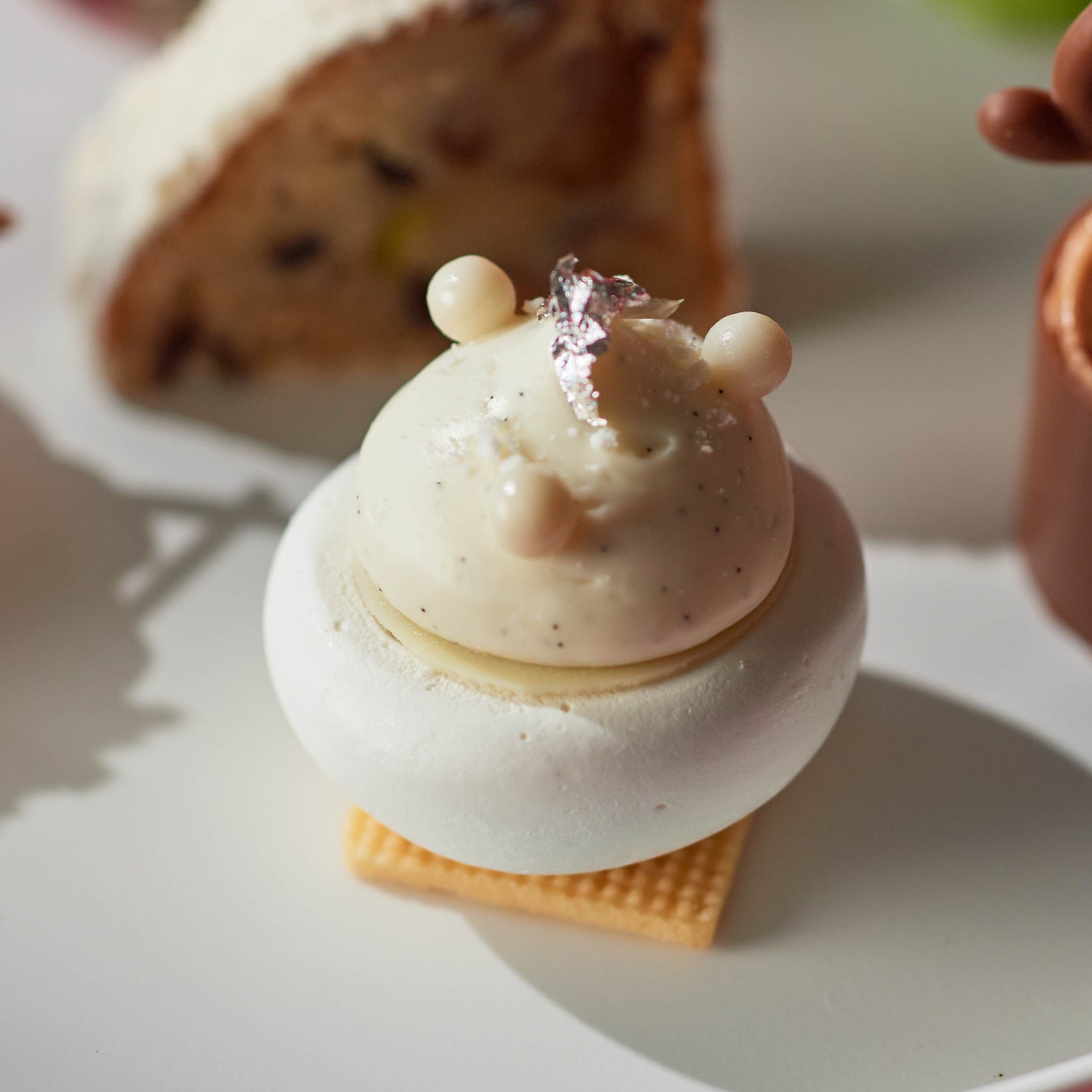 クリスマスのオーナメントをイメージして作られ、デコレーションには銀箔とホワイトチョコレートのパールクラッカーを乗せて、上品でシックな装いに仕上げました。メレンゲの中から華やかに薫るオレンジマーマレードにヘーゼルナッツとキャラメルから作られた自家製プラリネを重ね、相性抜群のチョコレートとオレンジの心地よい甘さと苦みの余韻をお愉しみ下さい。