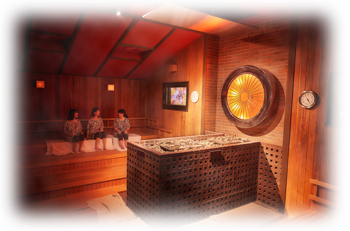 中央に設置されている炉から発生する遠赤外線により、デトックス効果・アンチエイジング効果が期待できます。イベント時には、正面の壁面に設置してある「熱波マシーン」が高速回転し強烈な熱風を発生させることで、強い発汗を促します。