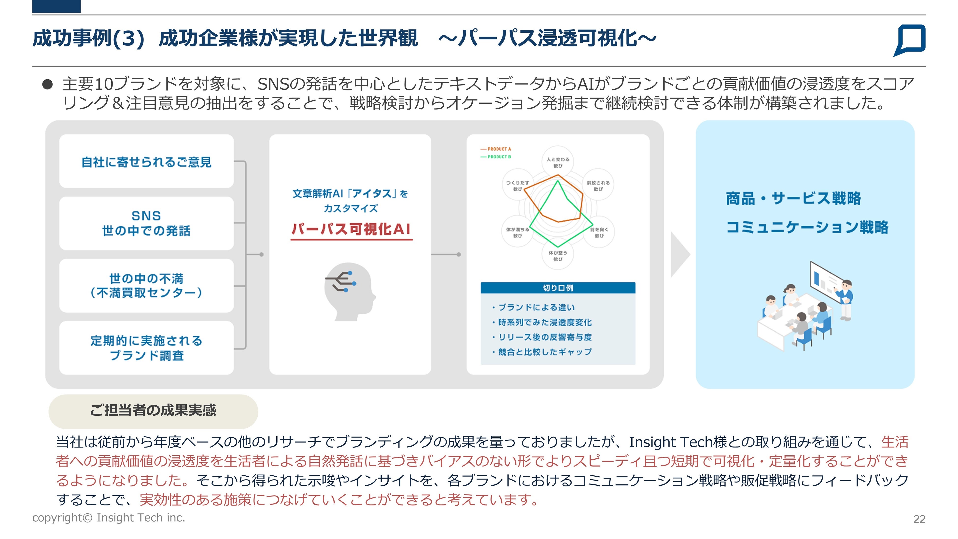 株式会社 Insight Tech(東京都新宿区、代表:伊藤友博、以下 Insight Tech)は、顧客や生活者の声(広義のVoC:Voice of Customer/Citizen)に耳を傾け、声の総体から経営課題を見出し改善するとともに、その中から新たな価値創出の可能性(イノベーションの種)を見出しビジネスを強くしていく“VoC経営”を総合的に支援しています。