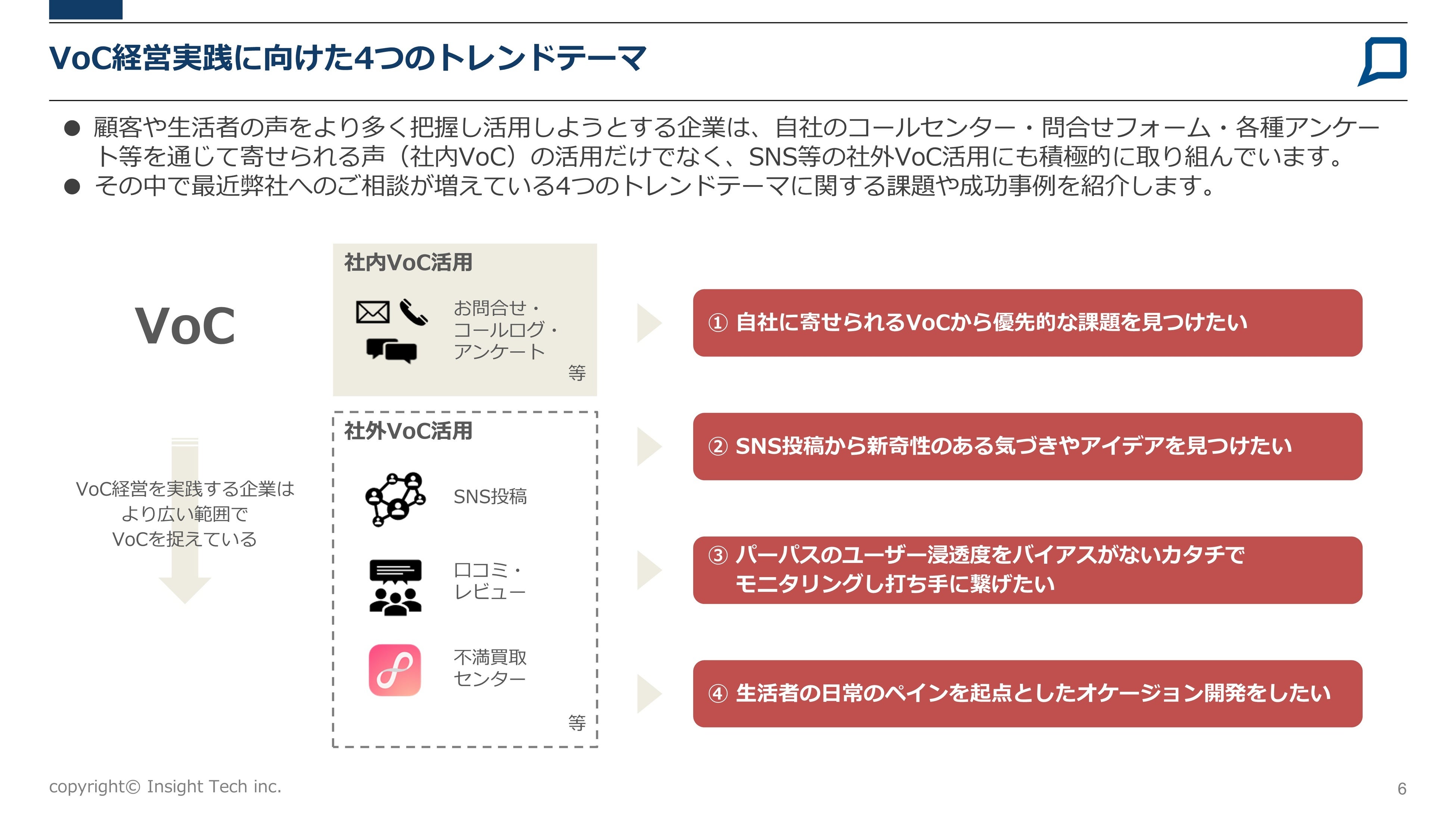 VoC活用を【経営レベル】で【仕組み化】していくような“VoC経営”を経営戦略の柱にしていく企業が増えている中で、下記4つのトレンドテーマに関するご相談が増えています。