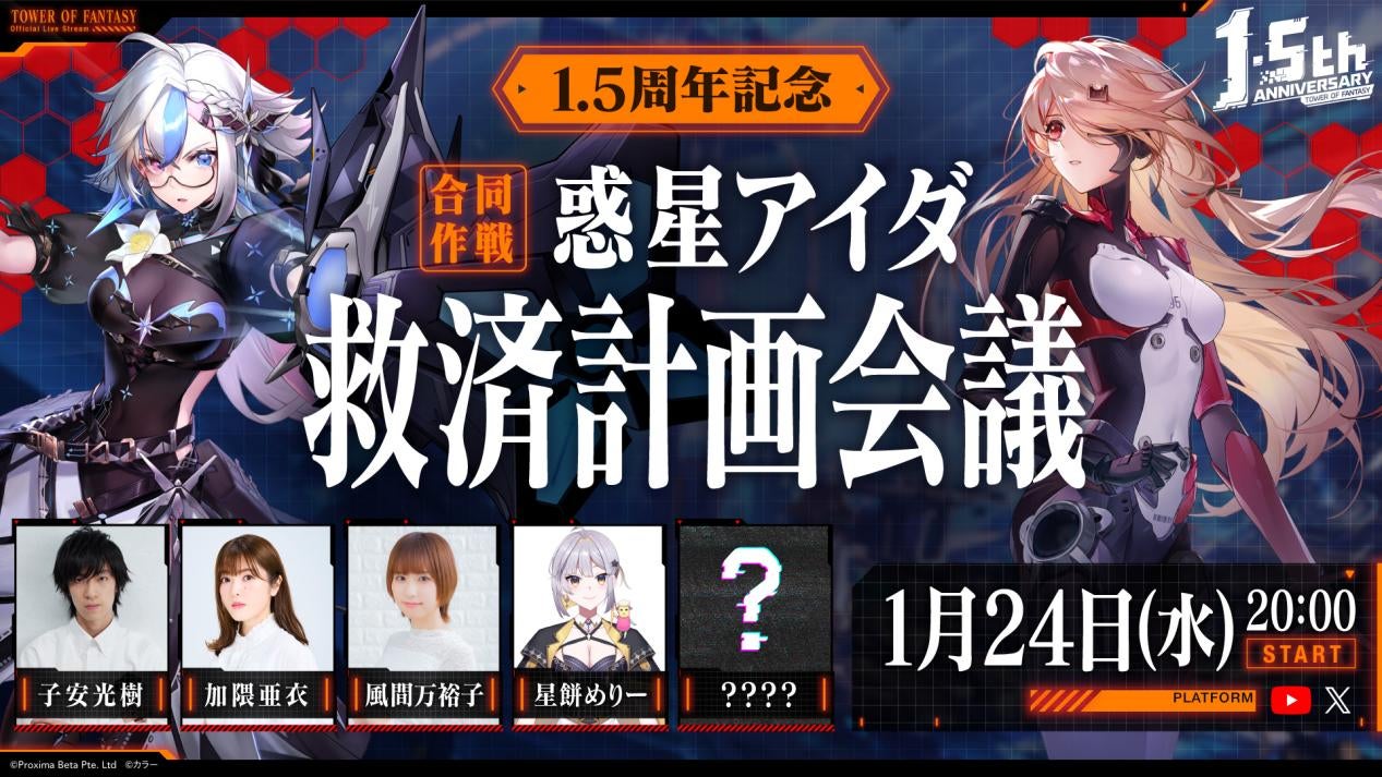 この生放送では、人気声優の子安光樹さん(寒露役)、加隈亜衣さん(※最新キャラクターを演出、生放送で公開)、風間万裕子さん(※最新キャラクターを演出、生放送で公開)及び人気YouTuberの星餅めりーさんが登場し、Ver.3.6「九舟遠望」のアップデート内容や1.5周年を記念した報酬豊富なイベントなど、見どころ満載の内容で探索者の皆様をお迎えします。また、幻塔リリース後の初の大型コラボレーションに関する最新情報も併せて公開します。さらに、豪華プレゼントが当たる視聴者限定のキャンペーンも実施しますので、1月24日(水)20時に1.5周年記念生放送『「合同作戦」惑星アイダ救済計画会議』 をご視聴ください。