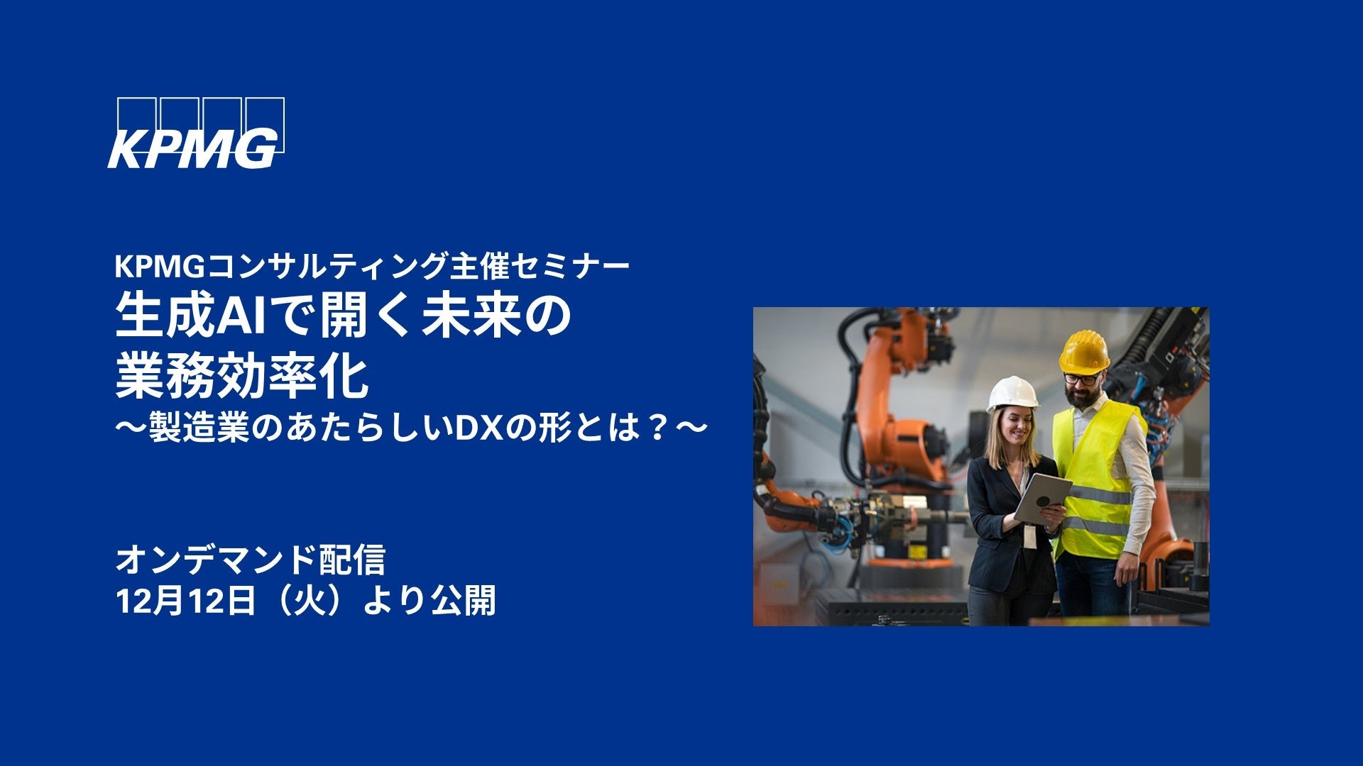 本セミナーでは、製造業界における生成AIの活用が、組織の業務効率化およびDX推進にどのように寄与するかを、生成AI活用の基礎から応用、およびソリューションデモを交えて解説します。また、KPMGが提供するサイバーセキュリティやガバナンス支援サービスを通じて、企業のビジネスモデルに生成AIを組み込む実践的な手法も提案します。