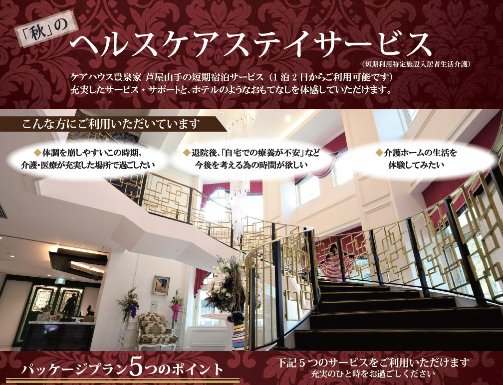 【介護ホームに短期宿泊】10月17日(月)~10月23日(日)急な気温の低下、体調管理をしながら安心して娯楽を楽しめる「短期宿泊(ヘルスケアステイ)」サービス!予約受付中