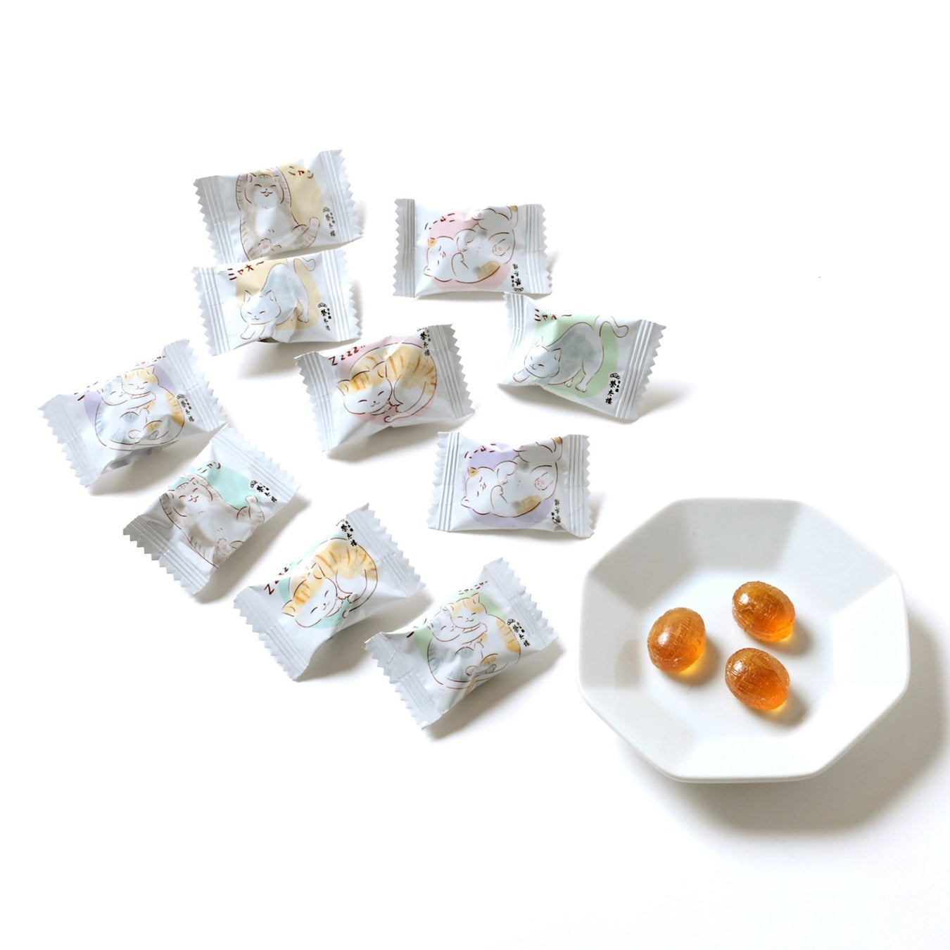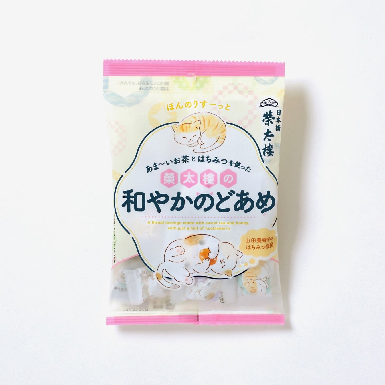 優しい味わいの癒しと猫の癒やしをかけて、パッケージにはくつろぐ猫のイラストを使用しています。榮太樓の和やかのどあめでほっと一息つきませんか?