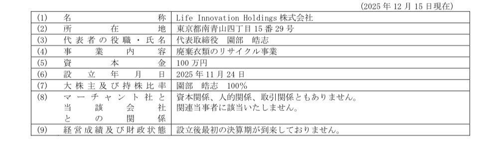 Life Innovation 社は、国内の大手アパレル会社のファッションデザイナーとしての経歴を持ち、2025 年11 月に、クレサヴァ株式会社(本社:東京都港区南青山三丁目4 番7 号401 号室、以下、「クレサヴァ社」といいます。)の代表取締役として、廃棄衣類のリサイクル事業および日本の伝統素材である和紙を活用した新たな素材・事業分野に取り組んできた園部皓志氏が、環境性と文化的価値を両立した持続可能な事業モデルの構築を通じ、循環型社会の実現と事業のさらなる成長を見据えて設立した会社であります。