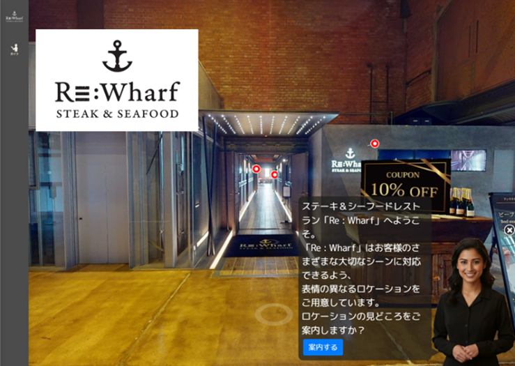 本実証では、横浜赤レンガ倉庫の人気店「Re:Wharf」「Disney HARVEST MARKET By CAFE COMPANY」の2店舗を期間限定でバーチャル化し、3D空間上で実際に来店したような直感的な体験(空間、食事、景観、店舗独自の演出体験等)を可能にします。