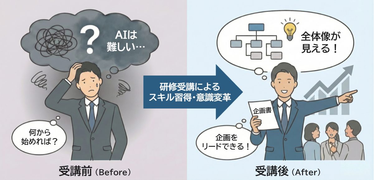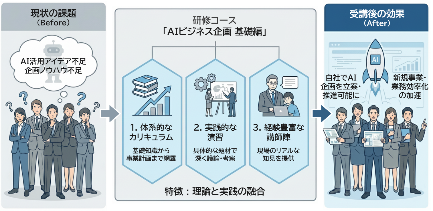 このような背景を踏まえ、本研修コースは、ビジネスの成果に結びつくAI活用の企画から推進までを一貫して行える人材の育成を目的として開発されました。