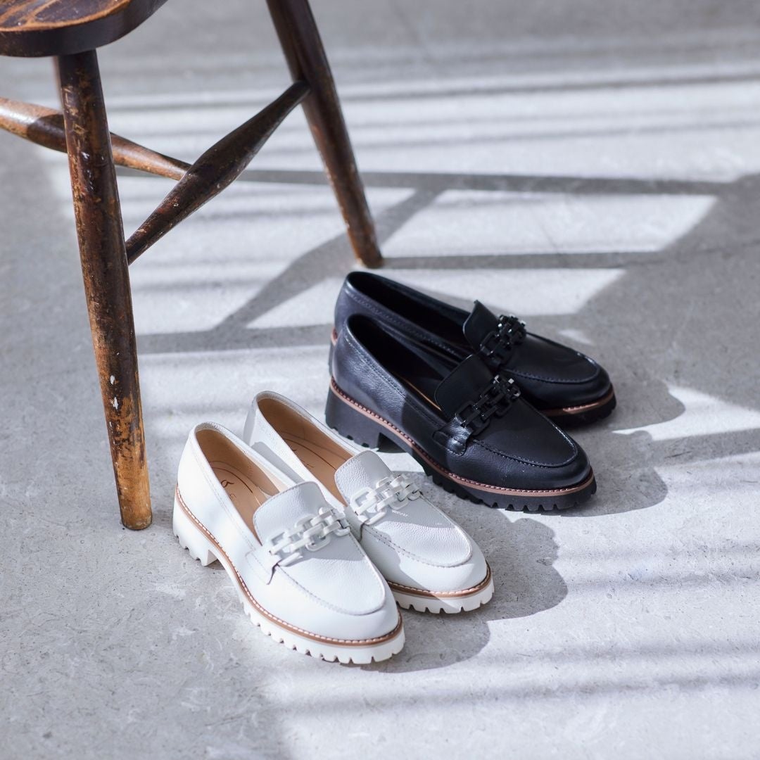 毎年大好評のボリュームローファーが、今シーズンはスクエアのチェーンによって一味違ったスパイスをプラス。春夏の足元を華やかに飾る「白」と秋冬から継続のベーシックな「黒」が登場します。とにかく軽量でクッション性に優れているため旅行シーンにも大活躍のきれい目シューズとしても人気。ローファーでありながらスニーカーのような履き心地を体感できます。
