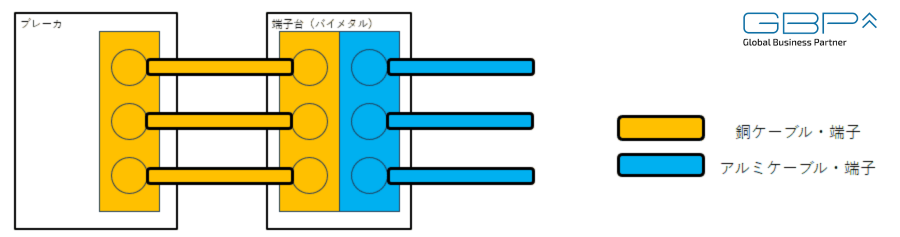 銅とアルミを直線接続すると、異種金属接触腐食(電食)が発生します。このため従来は、銅アルミ複合(バイメタル)端子台を用いて接続する方法が用いられてきました。しかしこの方法では、端子台の設置スペースが必要となり盤内が圧迫されるほか、端子台の取付や渡り配線など施工工数が増加するという課題がありました。