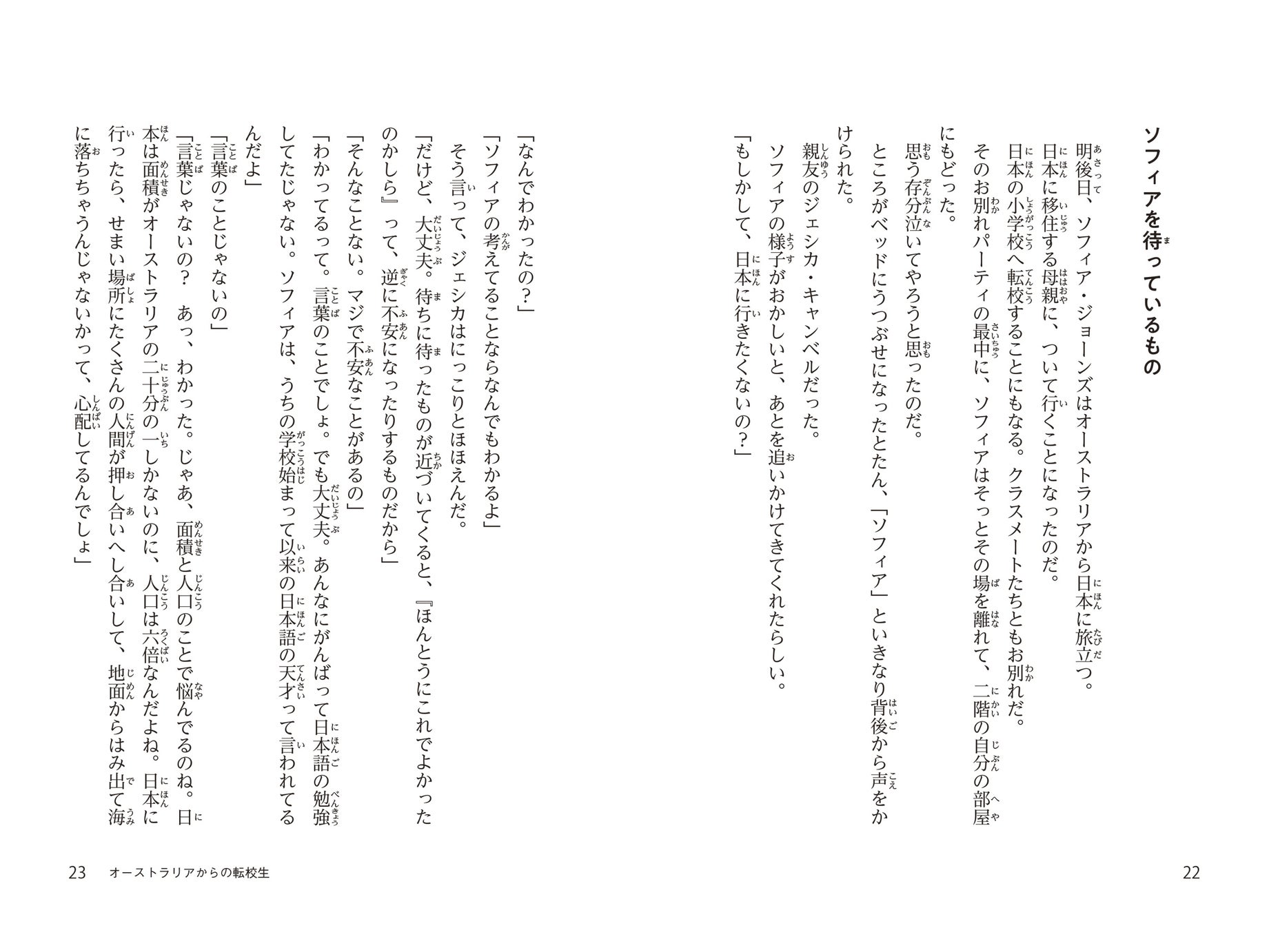 オーストラリアから来た転校生ソフィアは、学校から一緒に帰る児童や掃除当番など、日本の小学校生活に興味津々。でも、どうしても克服できないある悩みをかかえていた。その解決策を教えてくれたのは、早紀やルーカス、大地といった日本でできた友達だった。