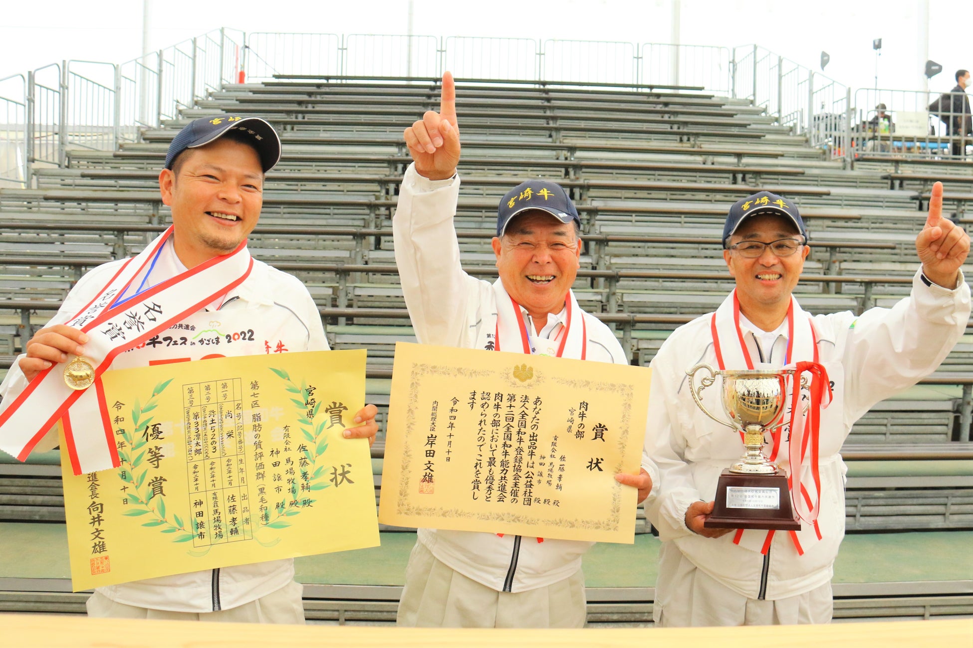 宮崎牛は、5年に一度開催され、別名「和牛のオリンピック」ともいわれる全国和牛能力共進会において、4大会連続で最高位賞の内閣総理大臣賞を獲得しており、令和4年10月に鹿児島県で開催された第12回全国和牛能力共進会においては、新設された「おいしさ」に関連するとされている脂肪の質を評価する出品区で同賞を受賞するなど、「おいしさ日本一」の評価をいただいております。