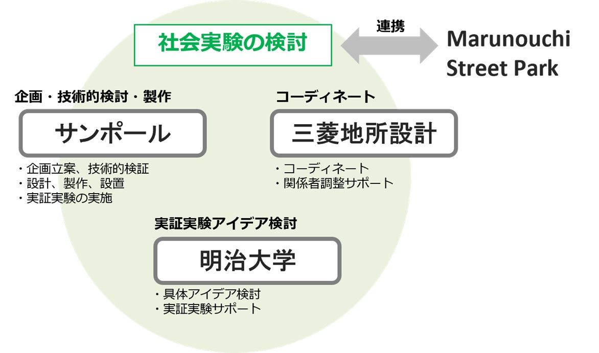 本社会実験は、丸の内仲通りの計画・設計に携わった三菱地所設計、地域住民や自治体と連携したプロジェクトへの参画を通してアーバンデザイン・プランニングの実践に取り組む明治大学理工学部 建築・アーバンデザイン研究室(佐々木宏幸教授)、ボラード・旗ポール等の製造販売を行うサンポールの産学連携による取り組みです。社会実験の実施にあたっては、三菱地所設計がコーディネーターとなり、明治大学の活動から得られる知見とサンポールの技術を活用し、丸の内仲通りをフィールドとして、ワークショップを重ねて方向性を検討してまいりました。