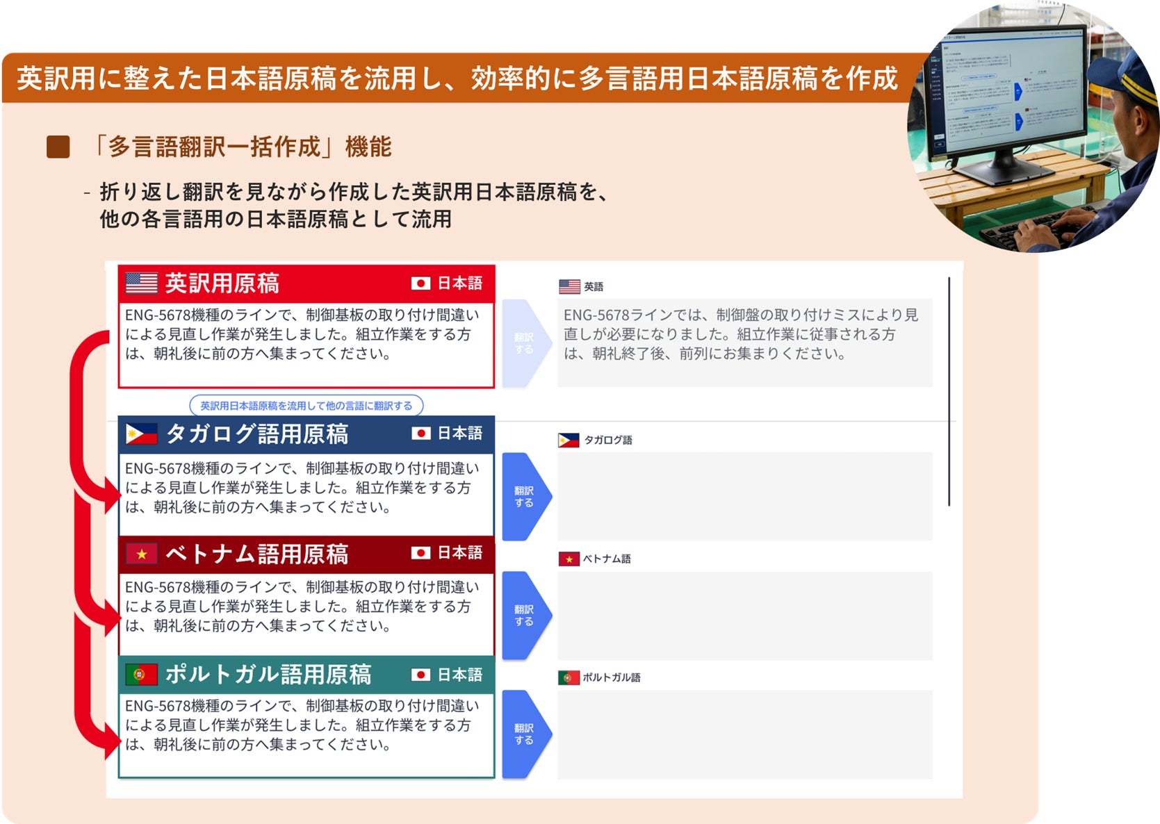 ・正しく翻訳できるように修正した英訳用の日本語原稿を、ポルトガル語やタガログ語など他の言語への翻訳用原稿として流用する「多言語翻訳一括作成」機能により、多言語への翻訳作業を効率化