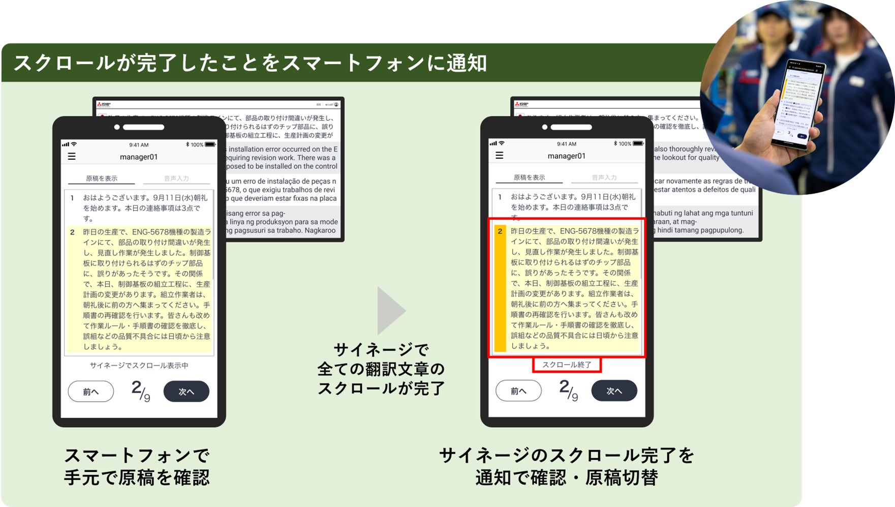 ・サイネージに表示される全ての翻訳文章のスクロールが完了したことをスマートフォンに通知することで、班長やリーダーはサイネージ画面を確認することなく、次の話題への切り替えが可能