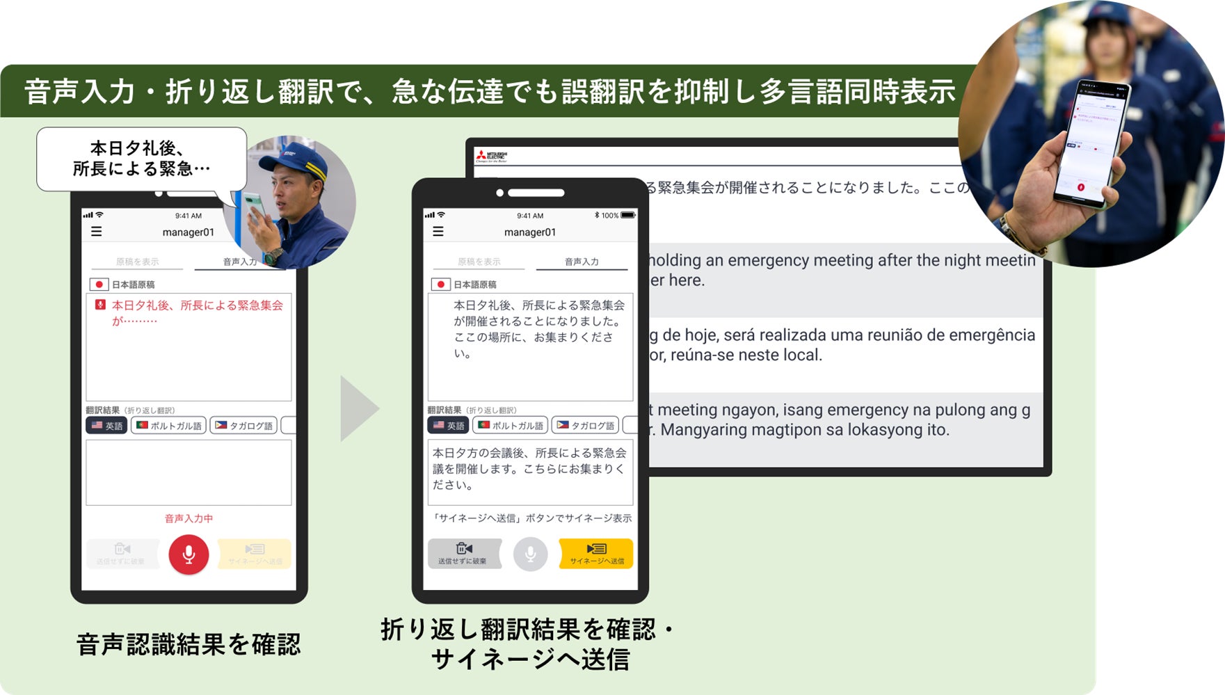 朝礼での外国籍従業員への円滑な伝達を実現する「翻訳サイネージ™」を開発