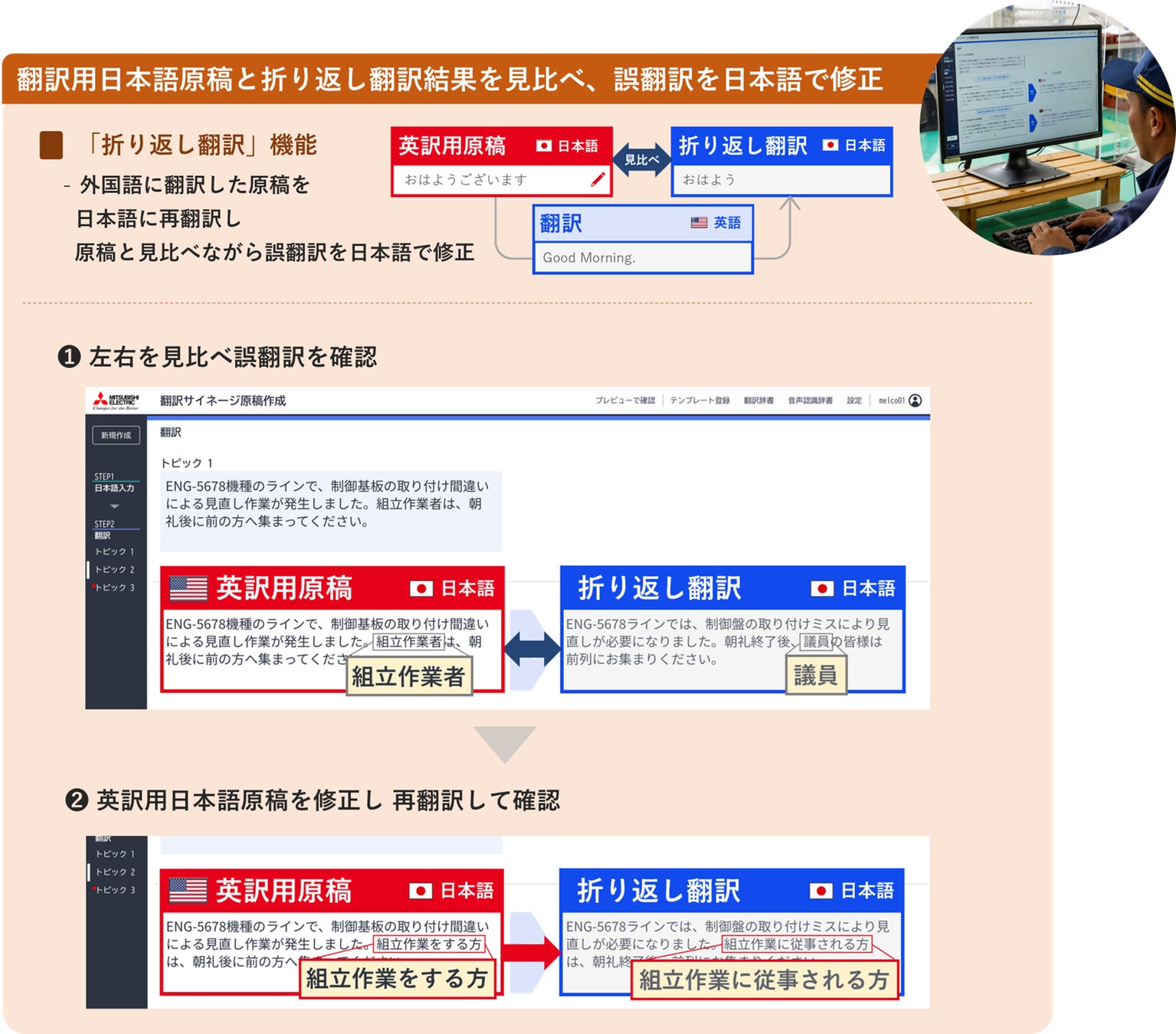 ・外国語に翻訳した原稿を日本語に再翻訳する「折り返し翻訳」機能により、誤翻訳を削減。また、日本語原稿と折り返し翻訳結果を左右で見比べることができるユーザーインターフェースの構築により、誤翻訳の日本語での確認・修正が可能