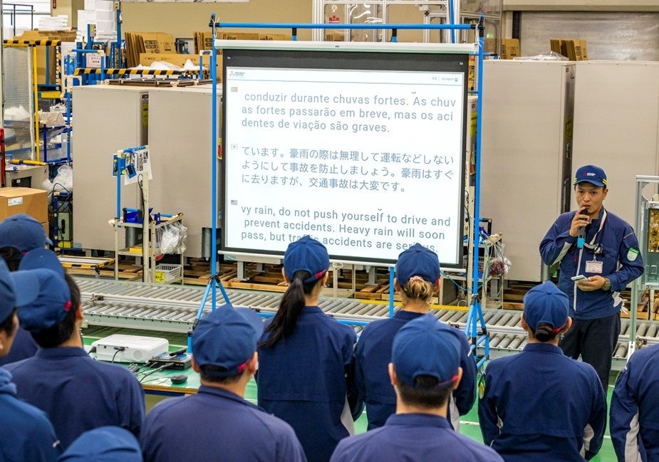 三菱電機株式会社は、国内の生産現場において雇用が拡大している外国籍従業員との円滑なコミュニケーションの実現に向けて、工場での朝礼など大人数が参加する場において、多言語を同時表示することで正確な内容を伝達できるシステム「翻訳サイネージ™」のコンセプトを創出し、プロトタイプを開発しました。