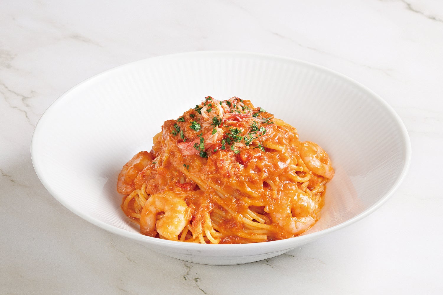オマールの豊かな香りと美味しさが溶け出した特製ソースと紅ずわい蟹、えびが織りなす格別な味わい。濃厚な魚介の旨みが絡む、もちもち食感の生パスタをご堪能ください。