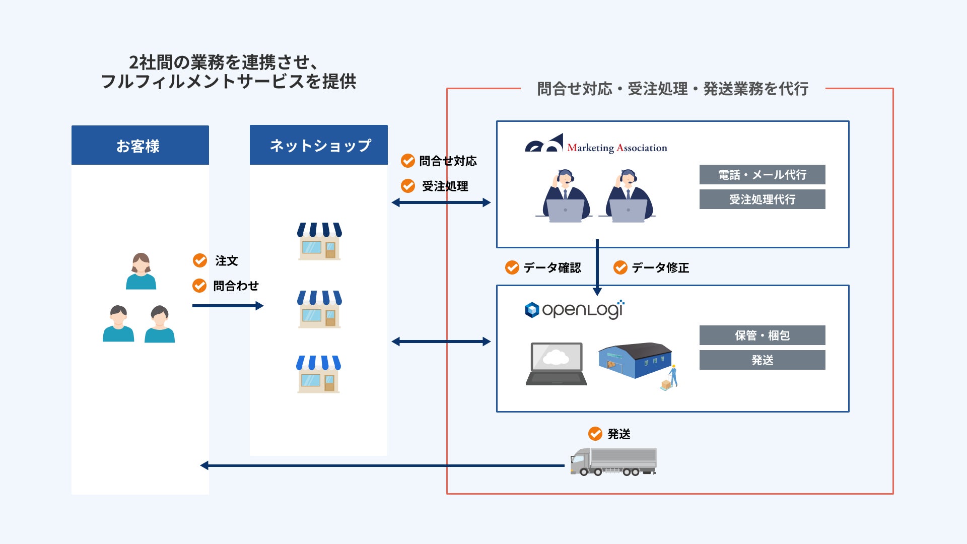 EC業界向けカスタマーサポート代行サービスを提供するマーケティングアソシエーション株式会社(本社:東京都台東区、代表取締役:中園広和)は、物流代行サービスを提供する株式会社オープンロジ(本社:東京都豊島区、代表取締役社長 CEO:伊藤秀嗣)と連携し、バックエンド業務を包括的に支援する「フルフィルメントサービス」を新たに開始いたします。