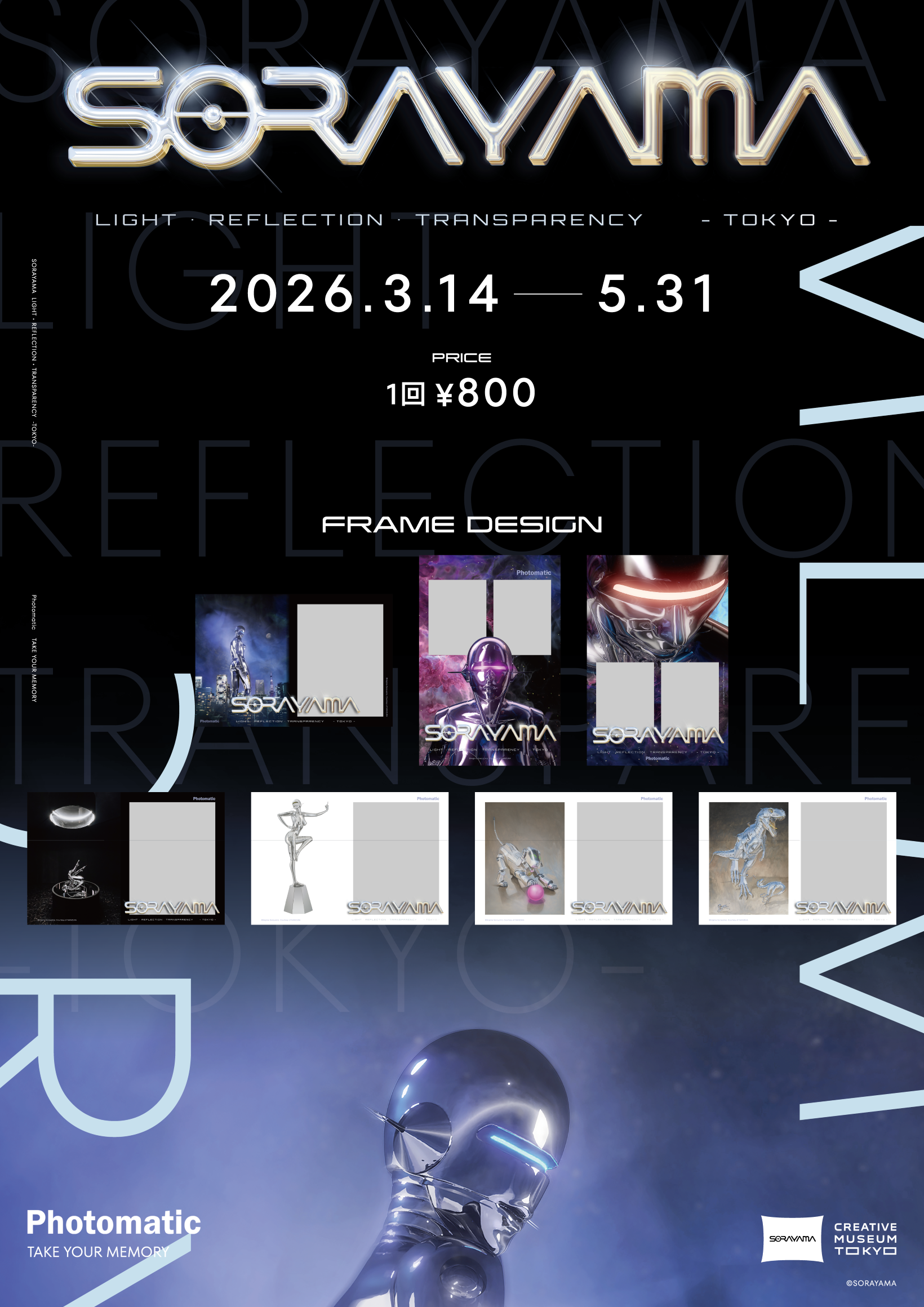 キタムラ・ホールディングス グループのピックハイブ株式会社(本社:東京都新宿区、代表取締役社長 兼 COO:大迫 由典)が運営するセルフフォトブランド「Photomatic(読み:フォトマティック)」は、2026年3月14日(土)より東京・京橋のCREATIVE MUSEUM TOKYOにて開催される、アーティスト・空山基氏による過去最大規模の回顧展『SORAYAMA 光・透明・反射 ーTOKYOー』にセルフフォトブースを設置いたします。回顧展の開催を記念し、空山基氏の作品をデザインした限定フレームで撮影をお楽しみいただけます。